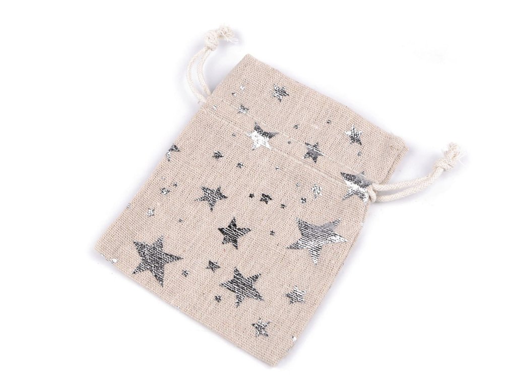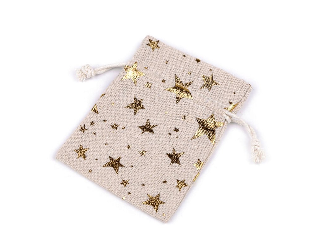 Malý dárkový pytlík je ozdobený metalickým potiskem hvězd. Poslouží na zabalení malých dárků, např. drobné kosmetiky. Může být i krásnou dekorací na Vánoce. Len, ze kterého je vyrobený, je kvalitní a pevný. Pytlík snadno uzavřete pomocí dvou bavlněných stahovacích šňůrek.