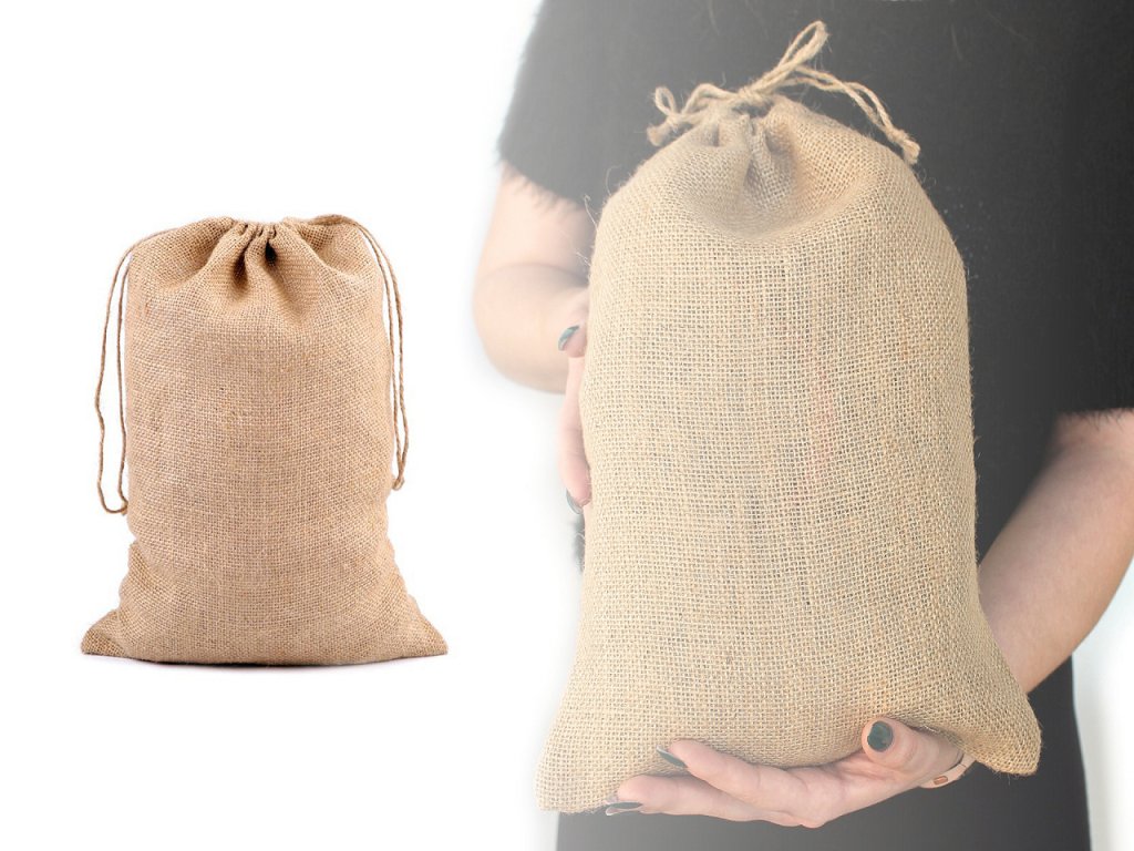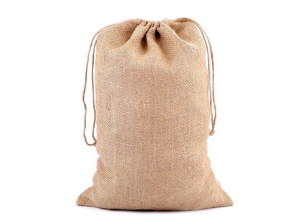 Velký jutový pytlík se snadno uzavírá pomocí dvou stahovacích šňůrek.