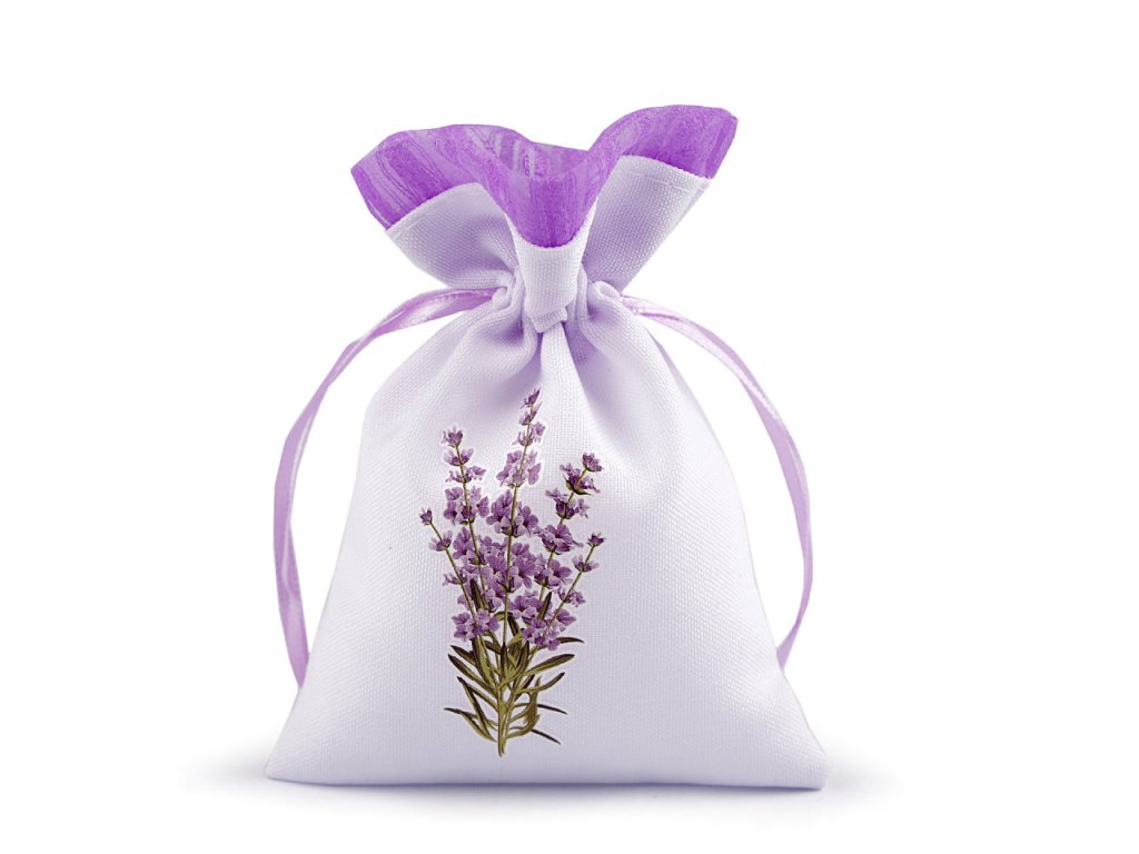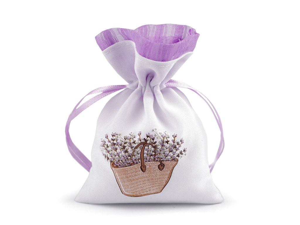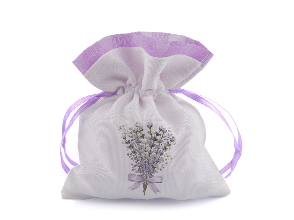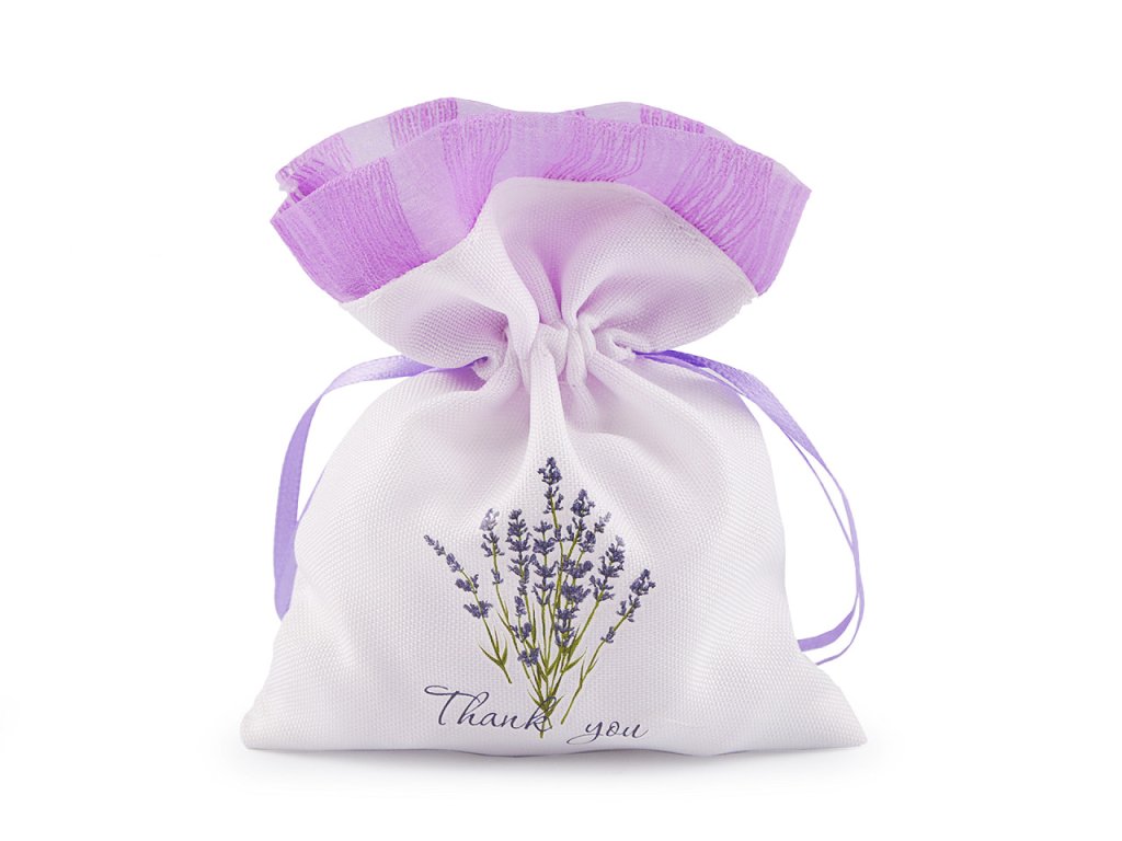 Plátěný dárkový pytlík je ozdobený potiskem květů levandule. Nahoře je olemovaný organzou. Snadno se uzavírá pomocí dvou stahovacích saténových šňůrek.