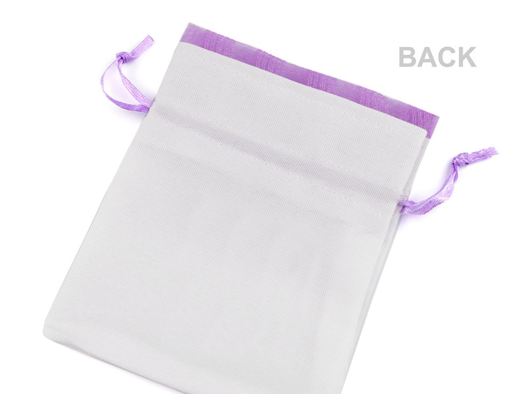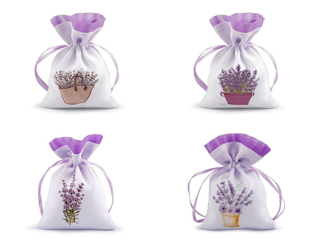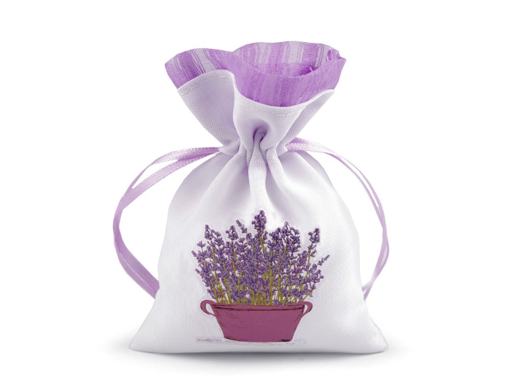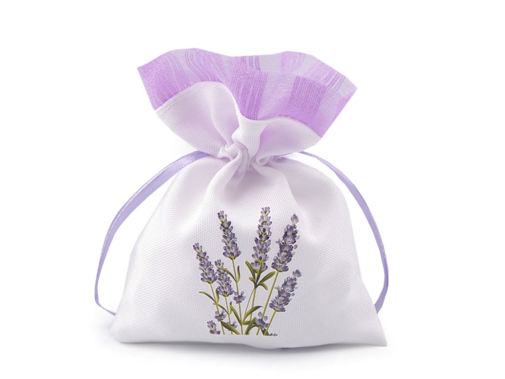 Plátěný dárkový pytlík je ozdobený potiskem květů levandule. Nahoře je olemovaný organzou. Snadno se uzavírá pomocí dvou stahovacích saténových šňůrek.