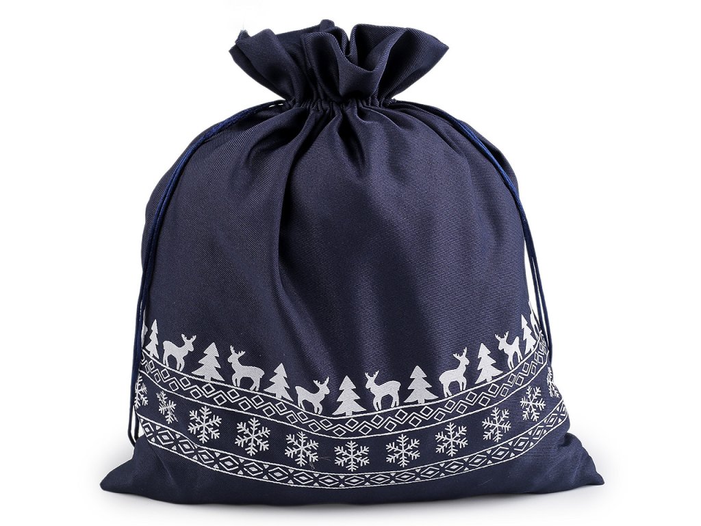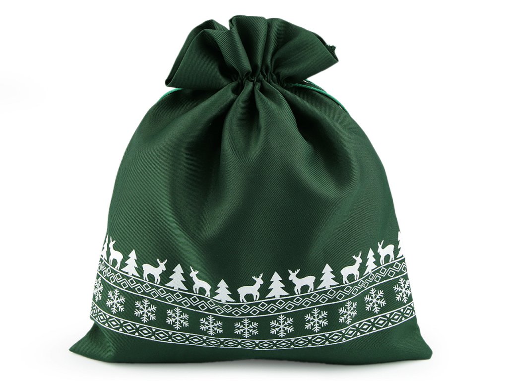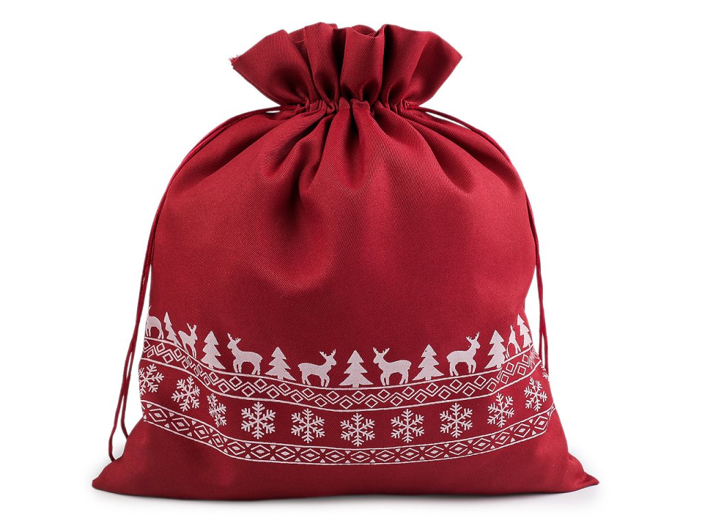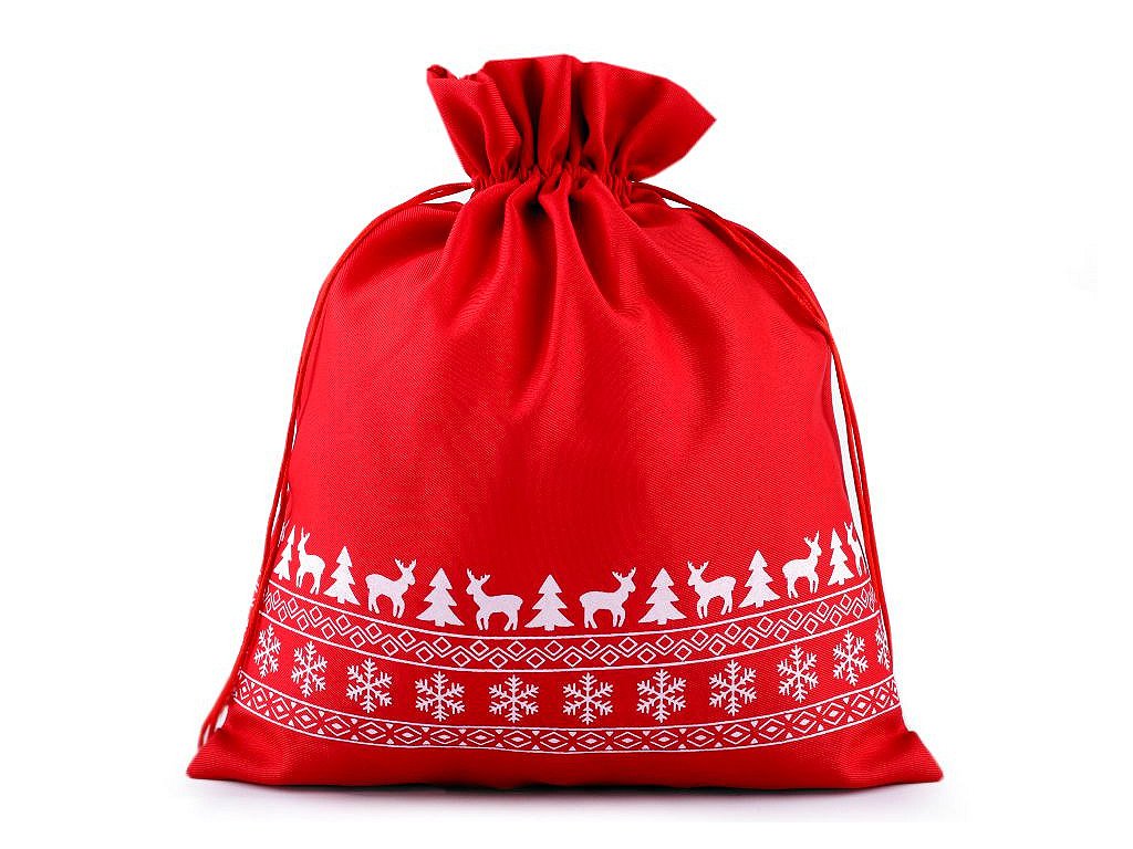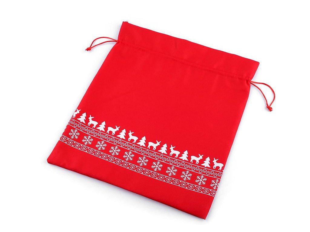 Pytlík s vánočními motivy se stahuje pomocí saténových šňůrek. Můžete ho použít na dárky nebo ho naplnit mikulášskou nadílkou. Dá se naaranžovat jako vánoční dekorace.