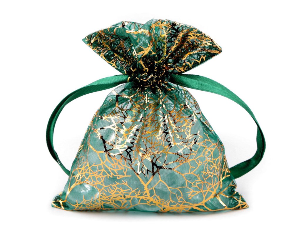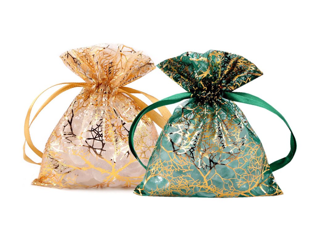 Dárkový pytlík zdobí zlatý metalický potisk větviček. Lze jej snadno uzavřít pomocí dvou stahovacích saténových šňůrek. Pytlík, vyrobený z organzy, je skvělým pomocníkem nejen při balení dárků, ale můžete do něj naaranžovat i sušené vonné květy apod. Je oblíbený i u příležitosti svatby na balení malých pozorností pro hosty.
