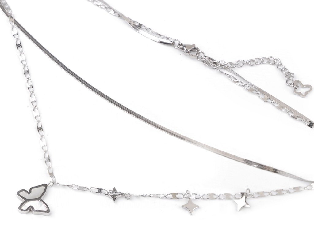 Dvojitý náhrdelník s přívěskem motýla a malých hvězd je vyrobený z kvalitní nerezové oceli. Motýl je s imitací perleti, hvězdy mají vysoký zrcadlový lesk. Jsou zavěšené na řetízku s plochými obdélníkovými očky, druhý hadí řetízek je plochý.
