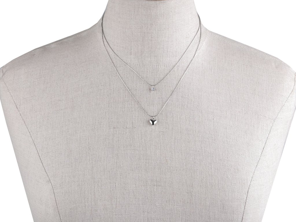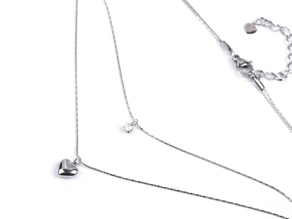 Dvojitý náhrdelník s přívěskem srdce a broušeným kamínkem je vyrobený z kvalitní nerezové oceli. Přívěsky jsou pomocí šlupny zavěšené na řetízcích, díky tomu se po nich volně pohybují. Řetízky jsou spojené, nedají se nosit samostatně.