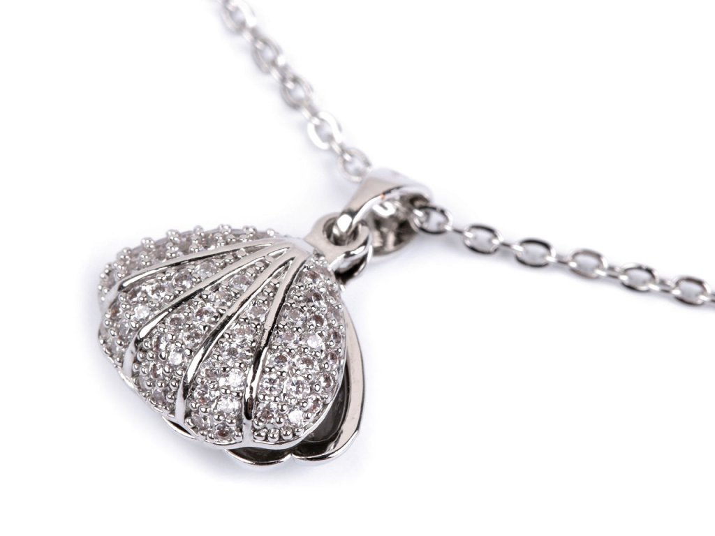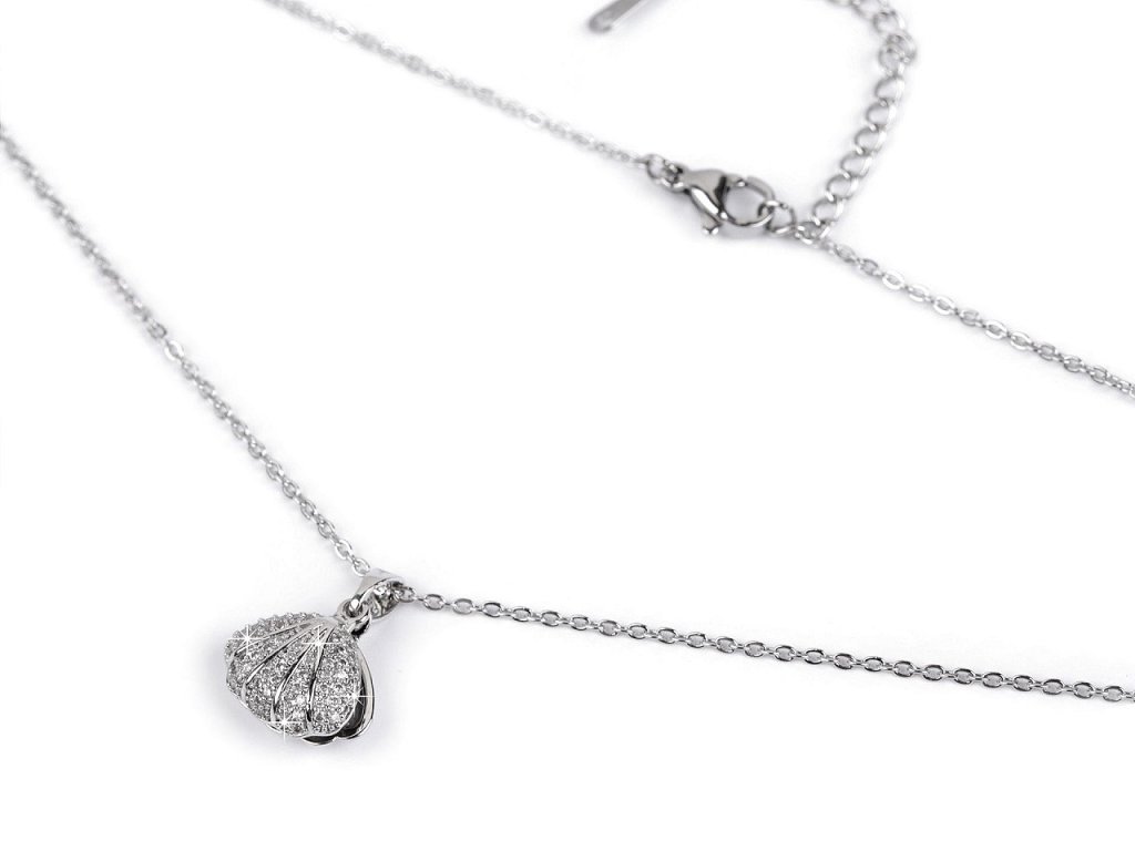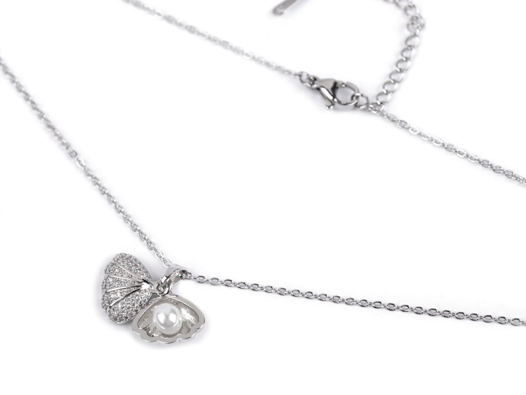 Řetízkový náhrdelník s přívěskem mušle s perlou je elegantní šperk, který zaujme svou jemnou estetikou. Je stylovým doplňkem pro každou příležitost, skvěle ladí s letními šaty na plážovou party i s elegantním večerním oblečením. Je vyrobený z kvalitní nerezové oceli. Přívěsek se jemně třpytí, je složený ze dvou dílů, horního a dolního, po otevření mušle je vidět perla schovaná uvnitř. Mušle je zavěšená na šlupně, volně se na řetízku pohybuje.
