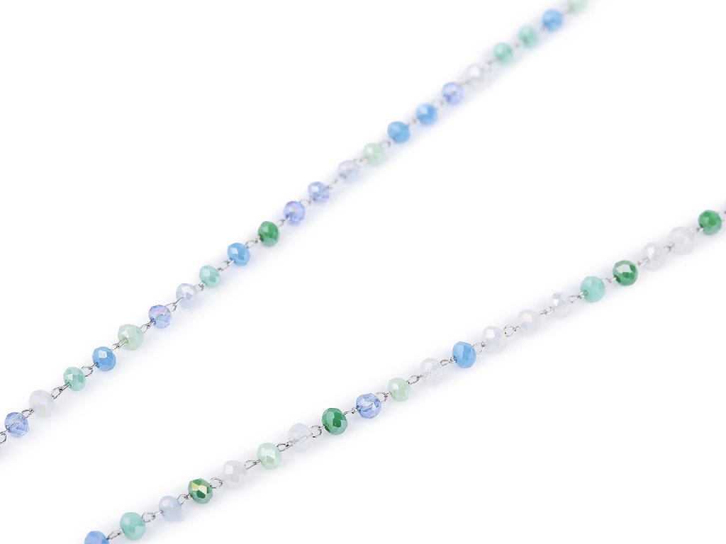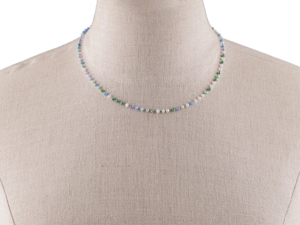 Jemný ketlovaný náhrdelník z kvalitní nerezové oceli je ozdobený barevnými broušenými korálky. Korálky se jemně třpytí, náhrdelník se hodí k slavnostním šatům i na běžné nošení, má velice všestranné využití.