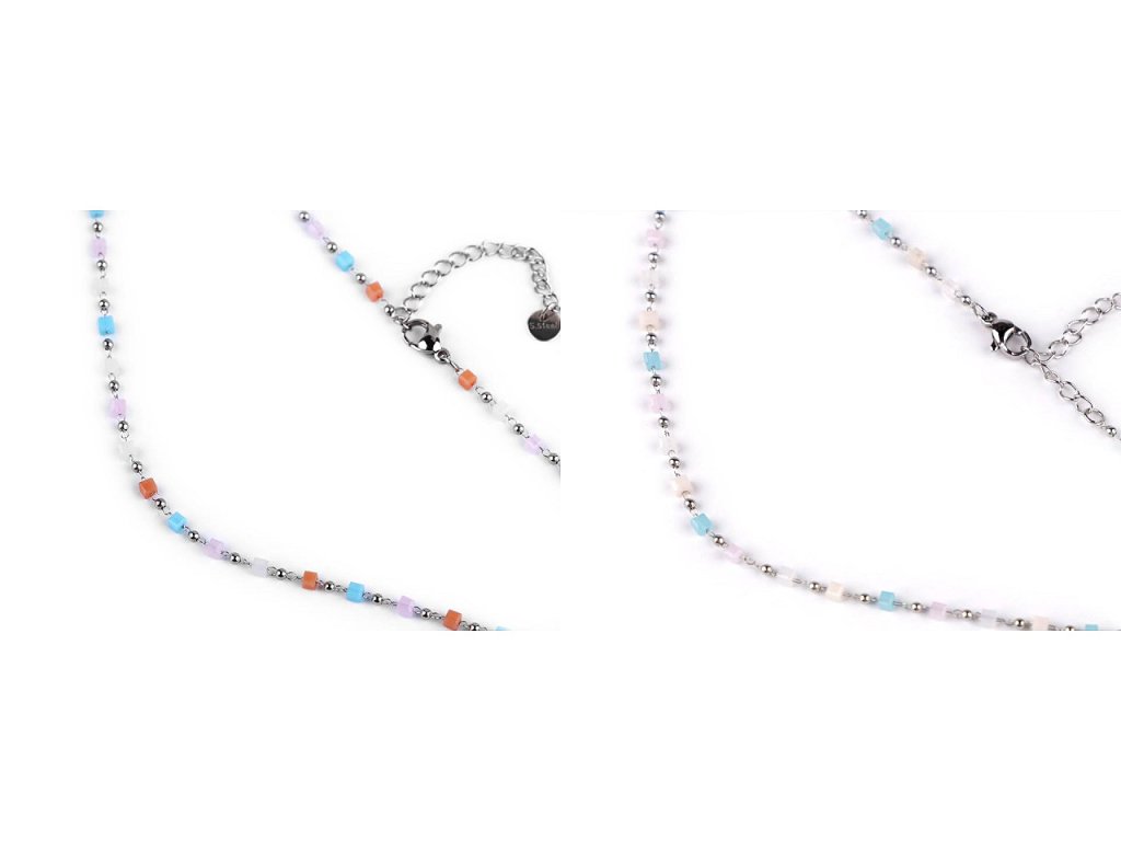 Jemný ketlovaný náhrdelník je vyrobený z kvalitní nerezové oceli. Je ozdobený broušenými korálky ve tvaru kostiček. Broušené korálky se jemně lesknou, náhrdelník se hodí k slavnostním šatům i na běžné nošení, má velice všestranné využití.