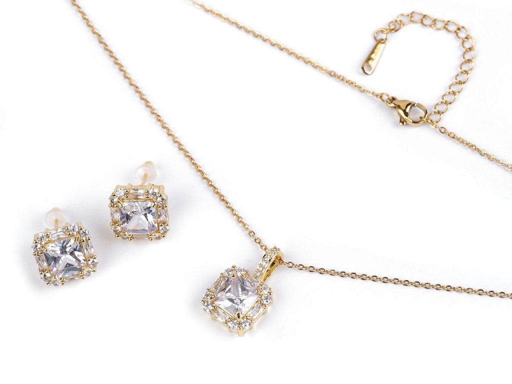 Náhrdelník se zapíná na karabinku s prodlužovacím řetízkem, náušnice jsou puzetové se silikonovými zarážkami proti vypadnutí.