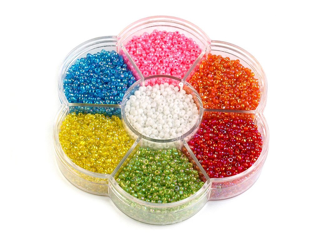 V boxu ve tvaru květu Ø100 mm je 7 barev a 100 g perliček. Každá barva váží cca 14 g.