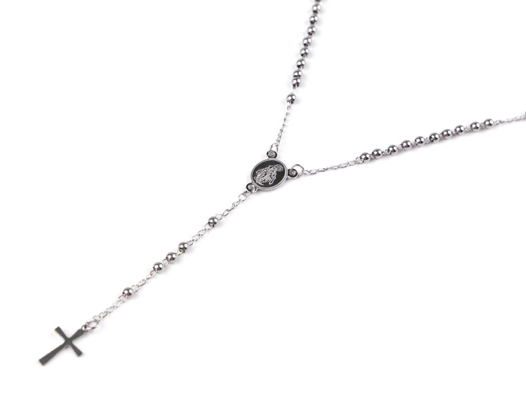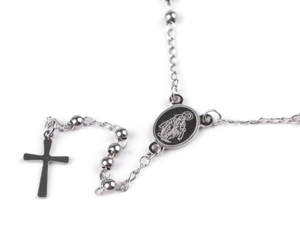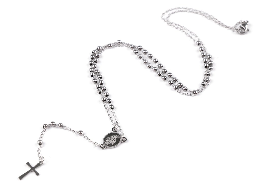 Růženec z nerezové oceli s drobnými korálky je velmi jemný. Dole je přívěsek Madony a křížek.