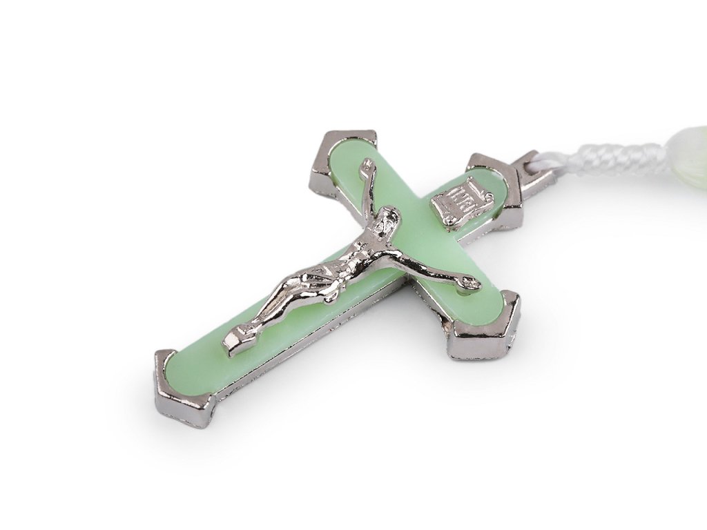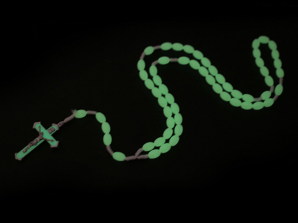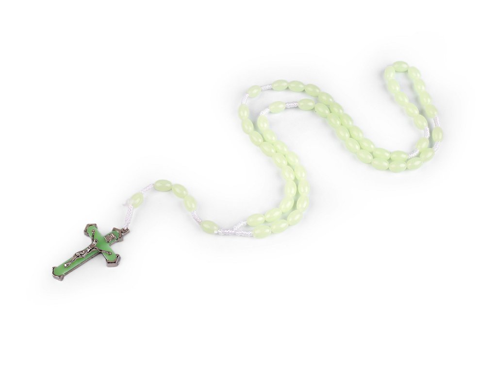 Růženec ze svítících korálků ve tmě vás potěší svým originálním designem. Je dostatečně dlouhý, dá se přetáhnout přes hlavu, můžete jej nosit na krku. Stačí jej přes den nechat ležet na světle nebo nosit na slunci, aby se světelně nabil a ve tmě bude sám zářit. Přes den oceníte jeho poutavou poloprůsvitnou barvu.