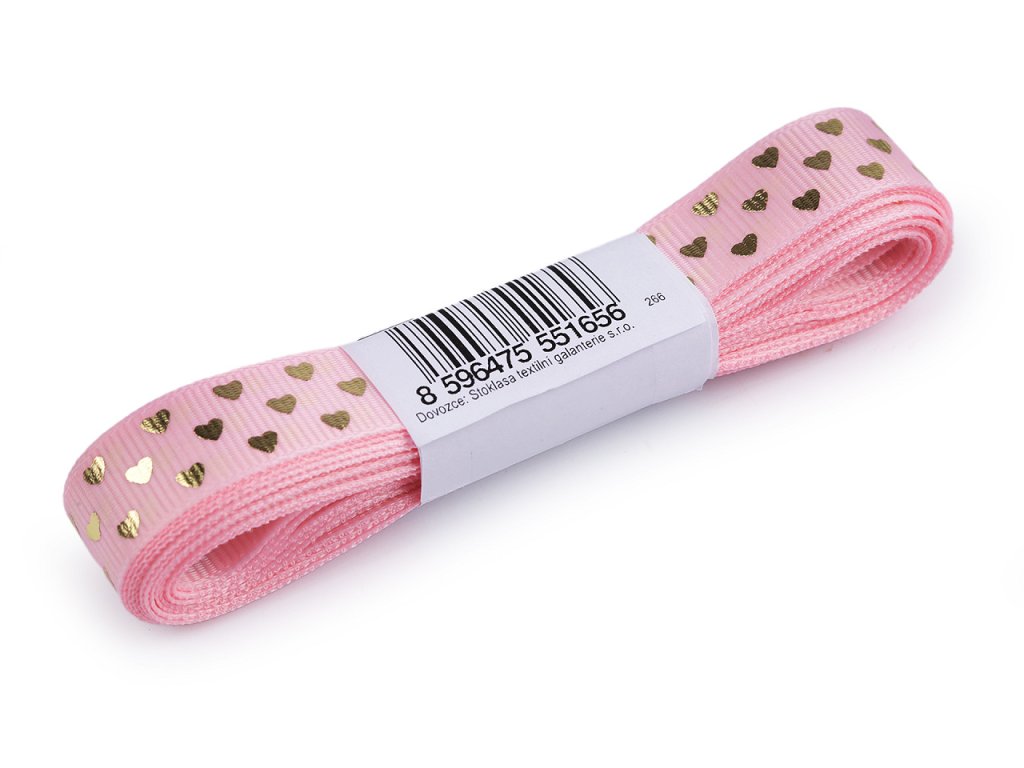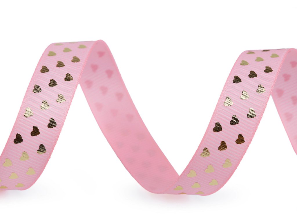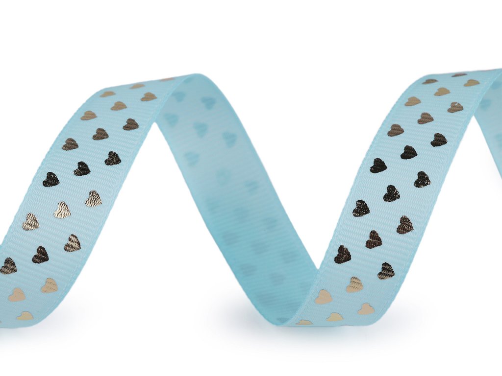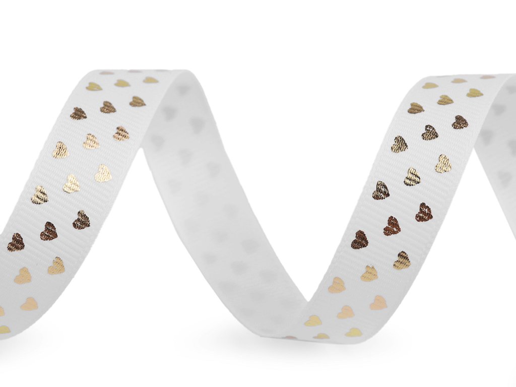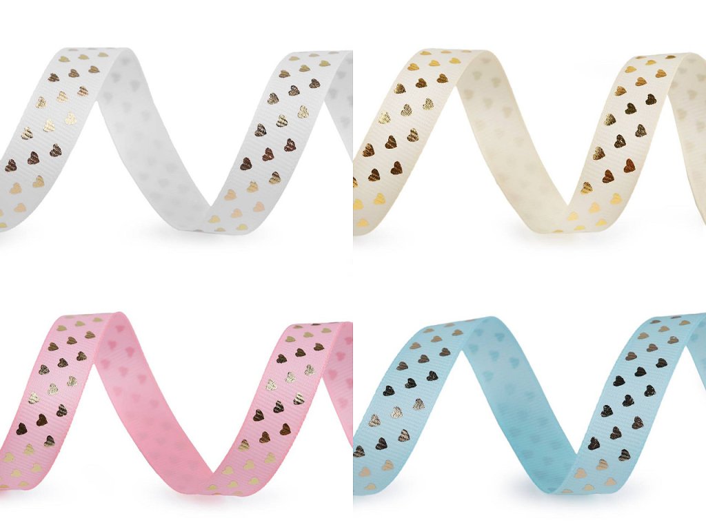 Dekorační rypsová stuha s metalickým potiskem srdcí je velice kvalitní. Na povrchu má typické jemné žebrování. Potisk je jednostranný.
