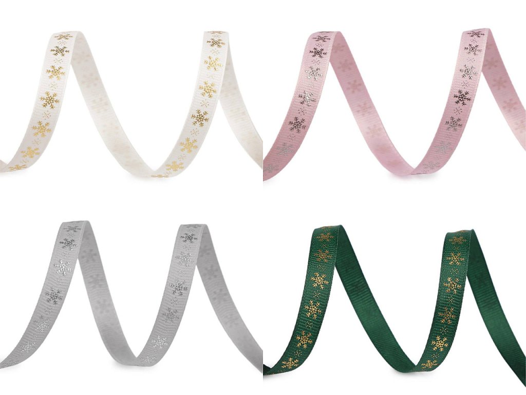 Dekorační rypsová stuha s metalickým potiskem vloček je pevná, na povrchu má typické jemné žebrování. Elegantní design vloček přináší pocit zimních svátků. Potisk je jednostranný.
