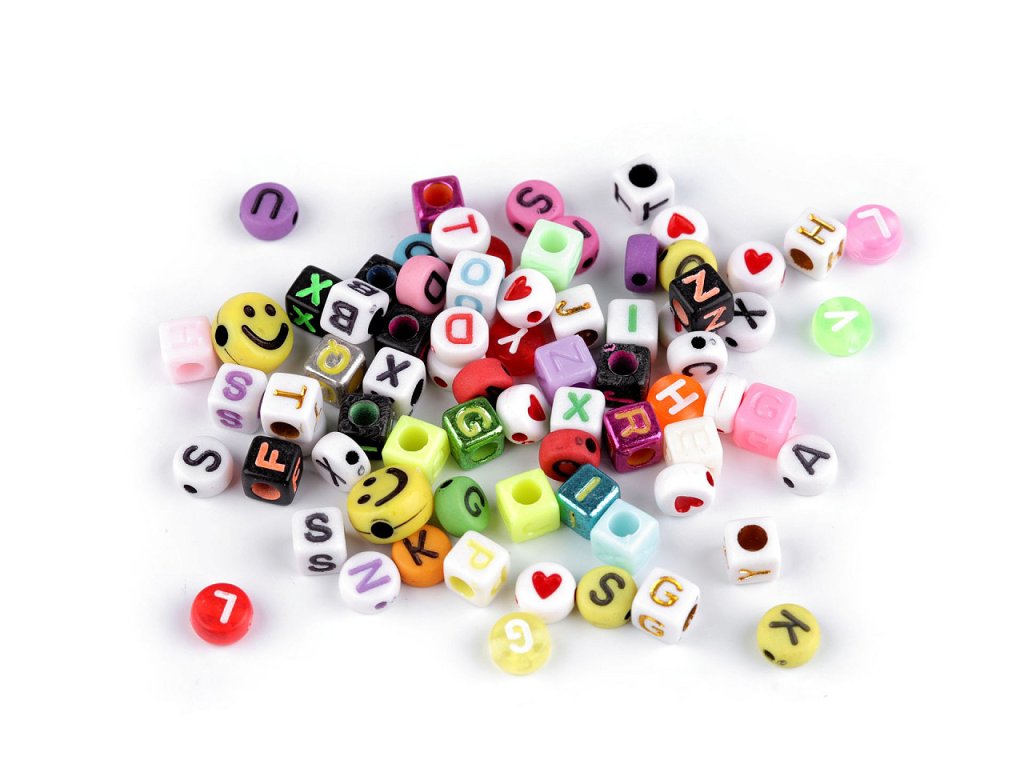 Mix plastových korálků s písmenky, srdíčky a smajlíky různých barev i tvarů potěší především školní děti. Jako návlekový materiál mohou použít pruženky a silony, různé šňůrky, gumičky apod.