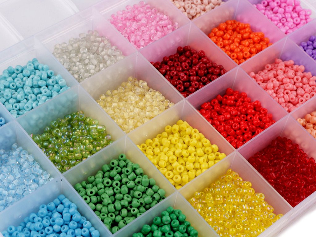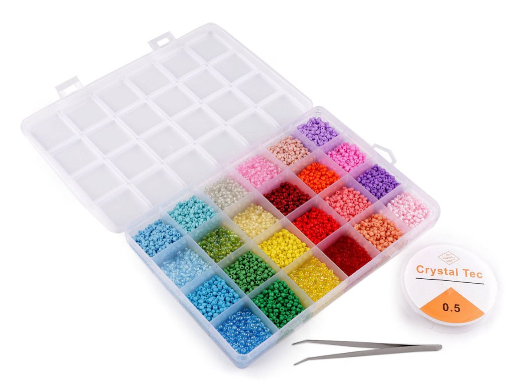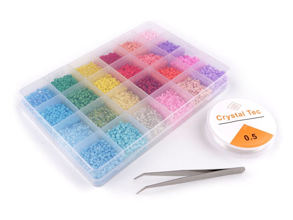 Plastový box obsahuje barevný mix skleněného rokajlu. Součástí sady je i silikonová pruženka a kovová pinzeta. Sadu využijete na tvorbu bižuterie a vánočních ozdob.