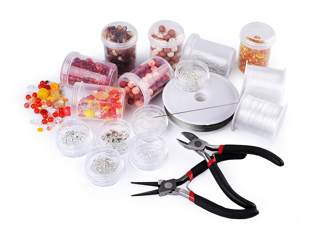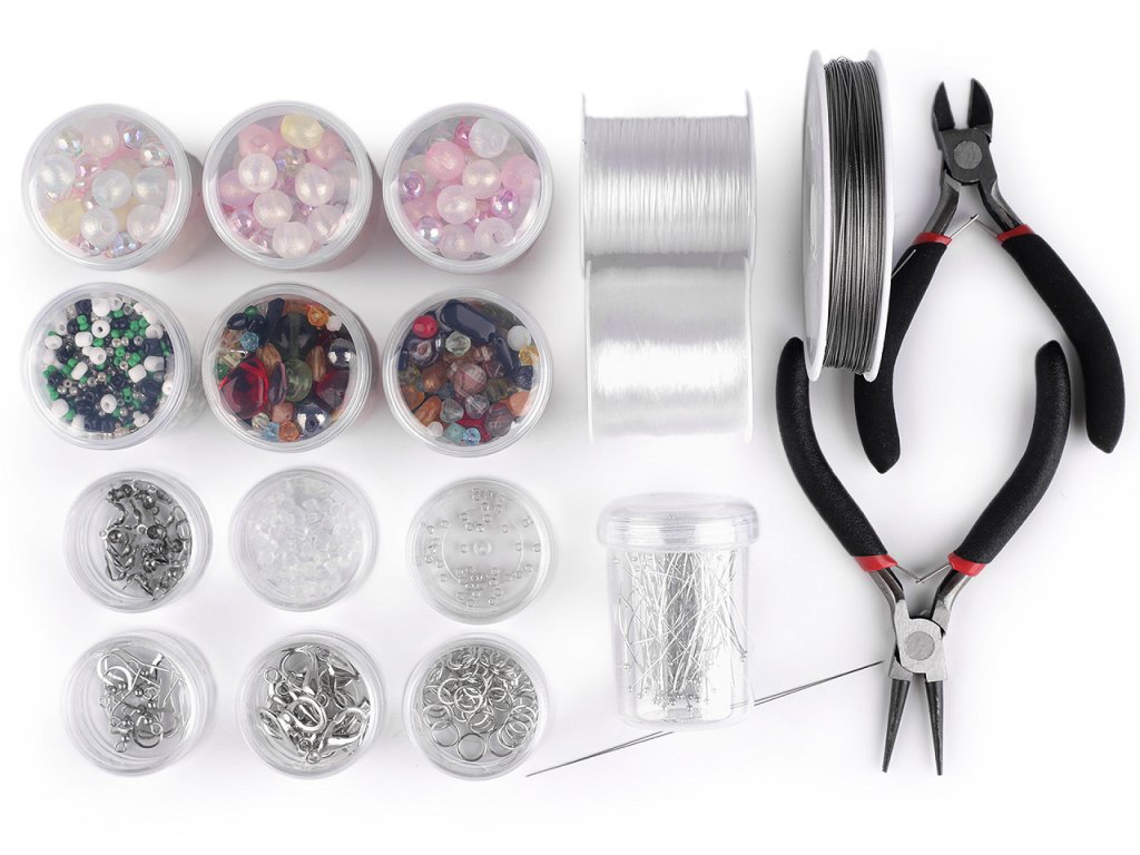 - 7 dóziček s komponenty: afroháčky 10 ks, náušnicové zarážky 2 g, karabinky 10 ks, ketlovací nýty 100 ks, kaloty 20 ks, zamačkávací rokajl 1 g, protikroužky dvojité 5 g