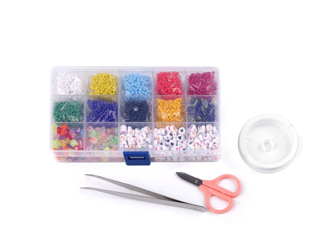 Sada rokajlů a plastových korálků v boxu potěší malé i velké korálkářky. Jsou skvělé na výrobu náramků a náhrdelníků, protože součástí celé sady je i silikonová pruženka, kovová pinzeta a nůžky. Určitě vás nadchnou i korálky s písmenky, čísly a srdíčky.
