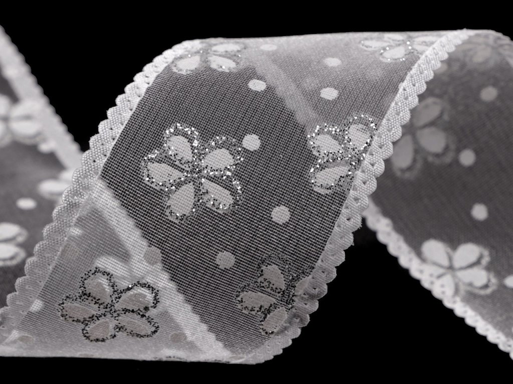Průsvitná organzová stuha s květy a puntíky je po stranách zpevněná saténovým okrajem s obloučky. Je pevná, jednostranná, květy jsou ozdobené glitry, které pevně drží, neodírají se.