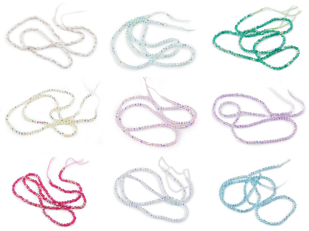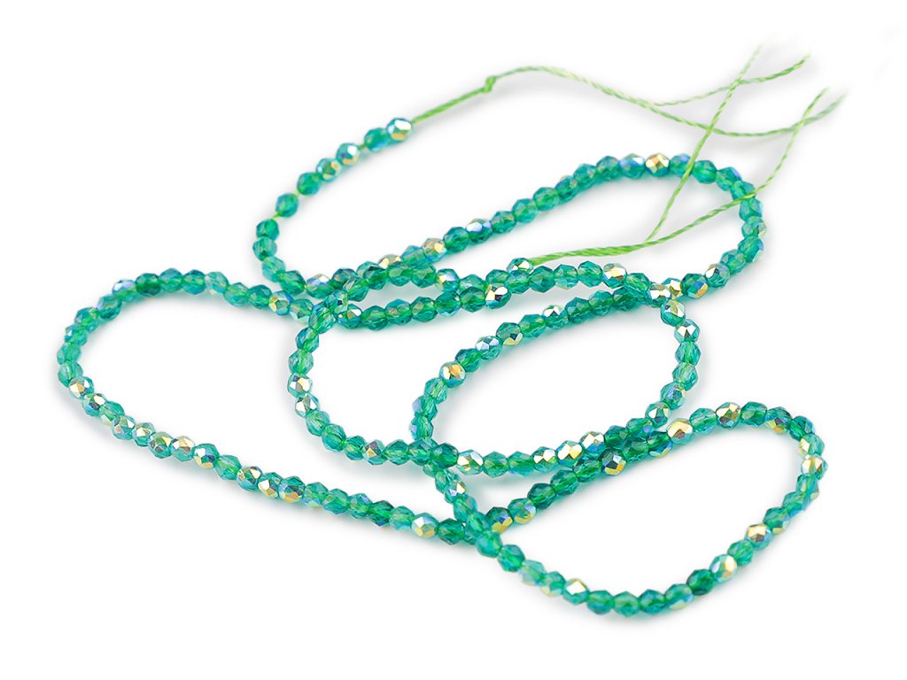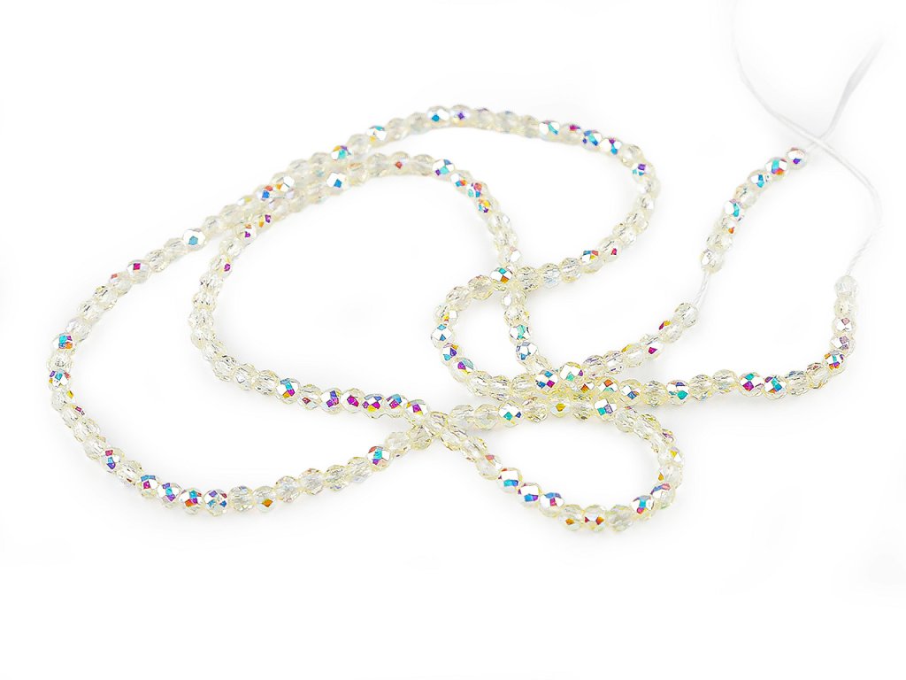 Skleněné korálky broušené ohňovky 2 mm s AB efektem, na šňůrce