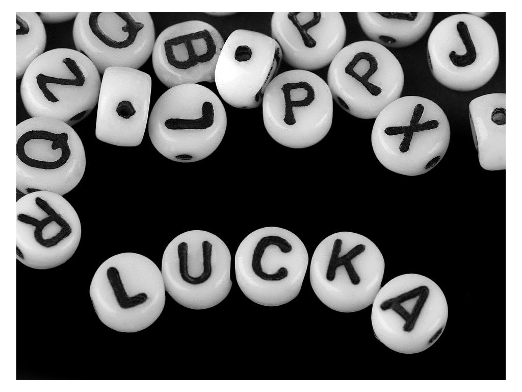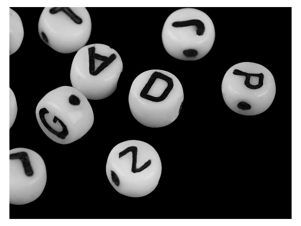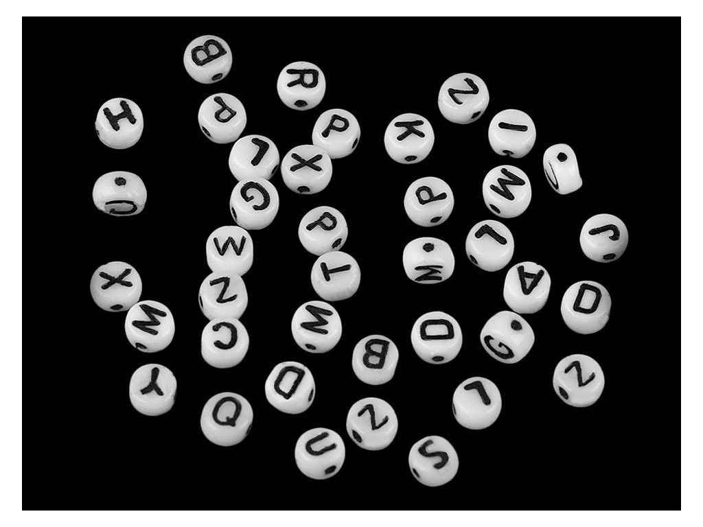 Korálky mají tvar kulaté placičky. Horizontálně umístěný průvlek umožňuje skládat z písmen slova, jména apod. Tělo korálku má bílou barvu, písmena jsou černá. Jako návlekový materiál můžete použít pruženky, silony apod.