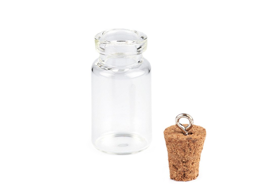 Malou skleněnou lahvičku využijete především na výrobu šperků. Můžete ji naplnit drobnými perličkami, broušenými kamínky, glitry, jemným barevným pískem, úlomky minerálů, kamínků apod. Po naplnění doporučujeme korkovou zátku do hrdla vlepit, aby se při nošení lahvička samovolně neotevřela.