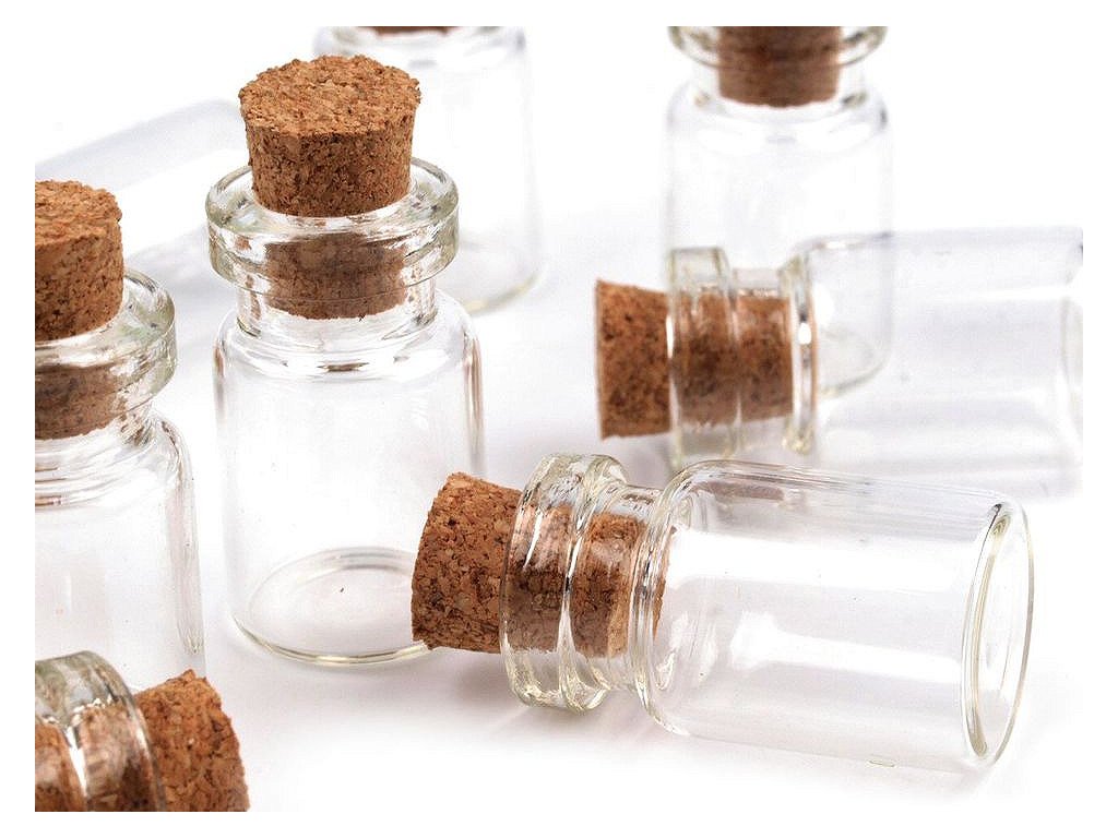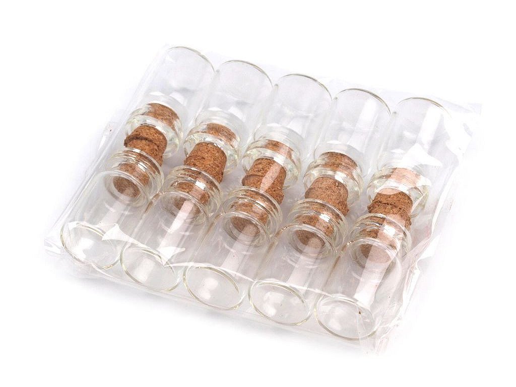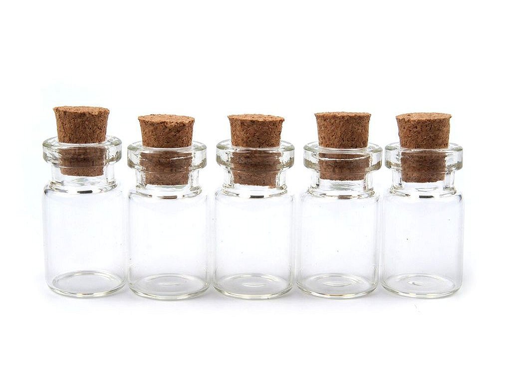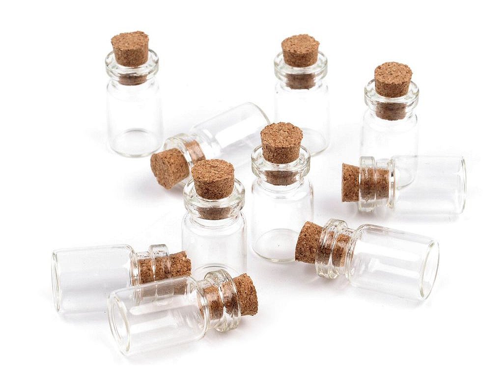 Velmi praktická a slušivá skleněná lahvička se nejčastěji používá jako přívěsek na krk. Zátka je vyrobena z korku. Lahvičku můžete dekorovat např. jemným barevným pískem, různými úlomky minerálů, kamínky, rostlinkami atd. nebo do ní lze vložit třeba i malý dopis. Jako šňůrku můžete použít kůži, která na přívěsku pěkně vynikne, řetízek či lanko.Rozměry lahvičky jsou 13 x 25 mm (průměr dna x výška). Průměr hrdla je 8 mm.Rozměry korku jsou 7 mm (širší průměr 9 mm) x 10 mm (průměr x výška).Obsah lahvičky po hrdlo je 1,5 ml.