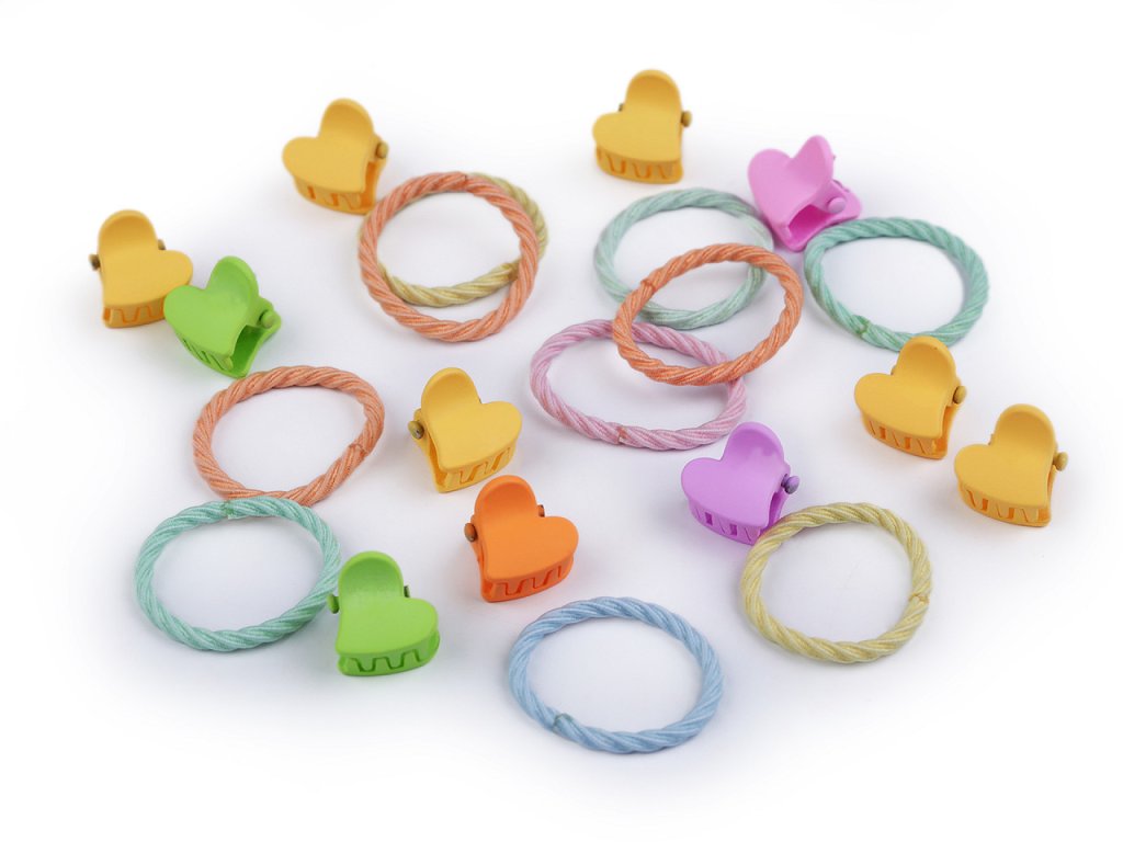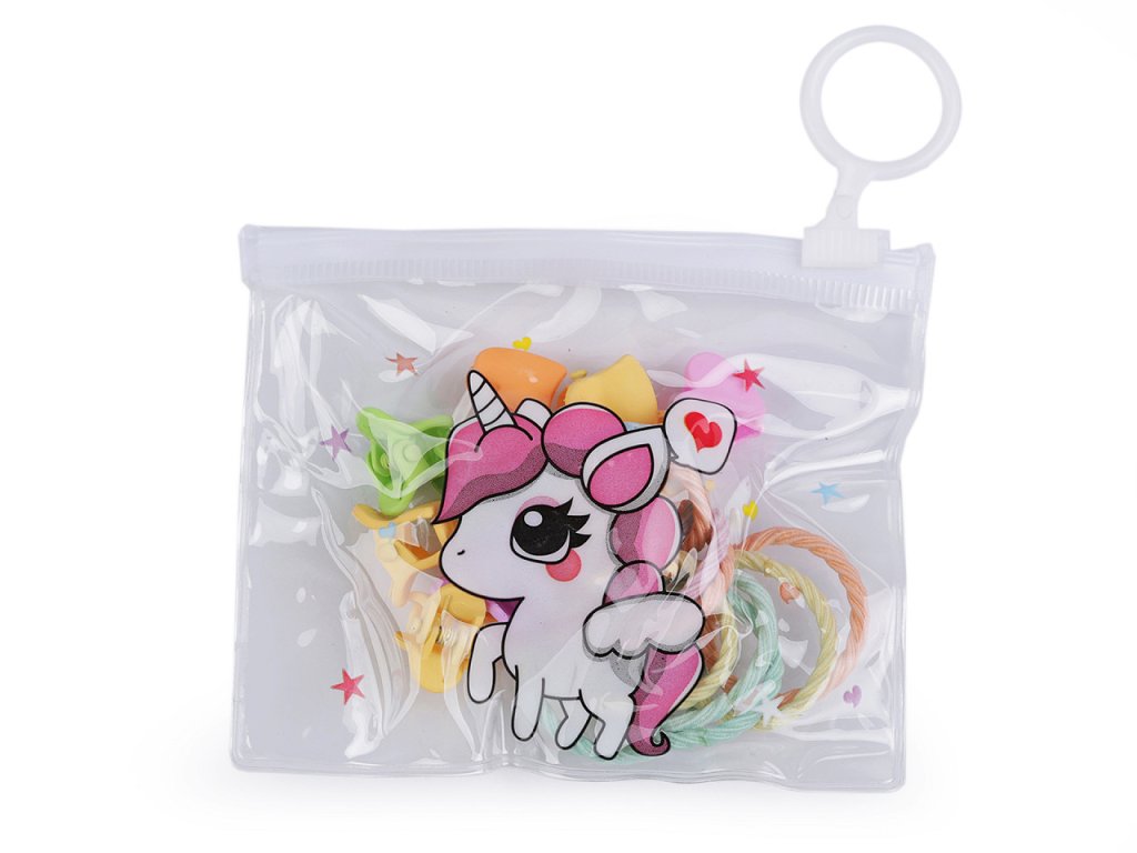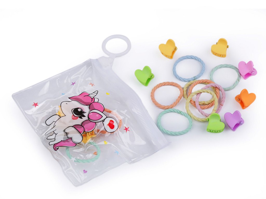 Sada barevných sponek skřipců se srdíčky a silikonových gumiček je velmi oblíbená. Dívky si mohou se skřipečky sepnout malé pramínky jemných dětských vlásků. Vše je uložené v transparentním zipovém pouzdře s potiskem jednorožce.