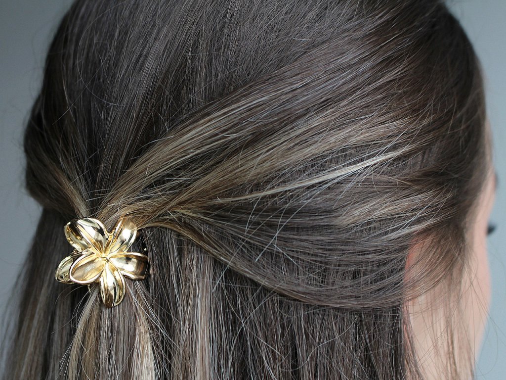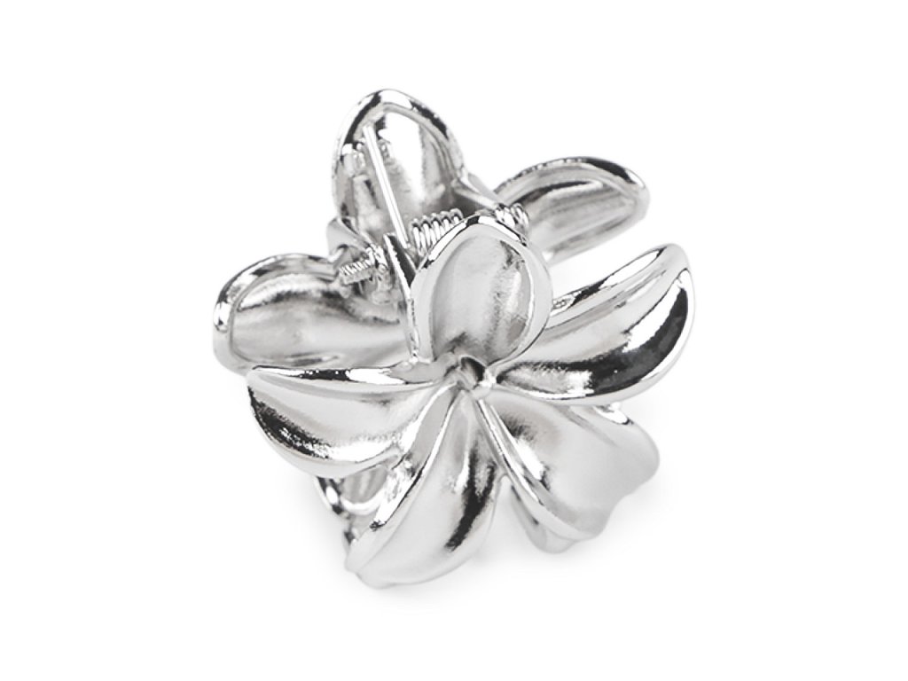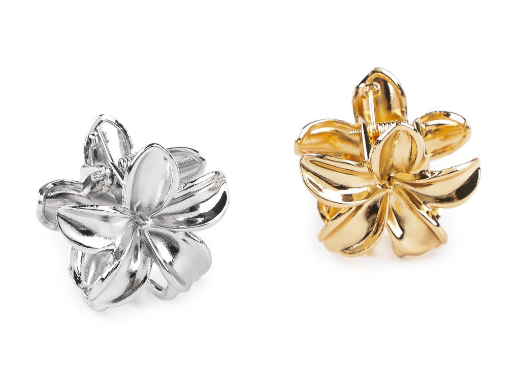 Malý kovový skřipec do vlasů ve tvaru květu je elegantním a stylovým doplňkem pro každodenní i slavnostní použití. Má vysoký lesk, díky svému silnému stisku a zubů udrží vlasy pevně na místě bez nepříjemného tahání nebo sklouzávání.