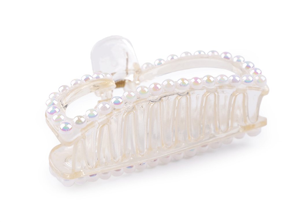 Skřipec do vlasů s perlovým designem vytvoří poutavý slavnostní účes během chvilky. Drží přesně na místě díky svému silnému stisku a dlouhým zubů. Má lesklý perlový povrch s AB efektem.