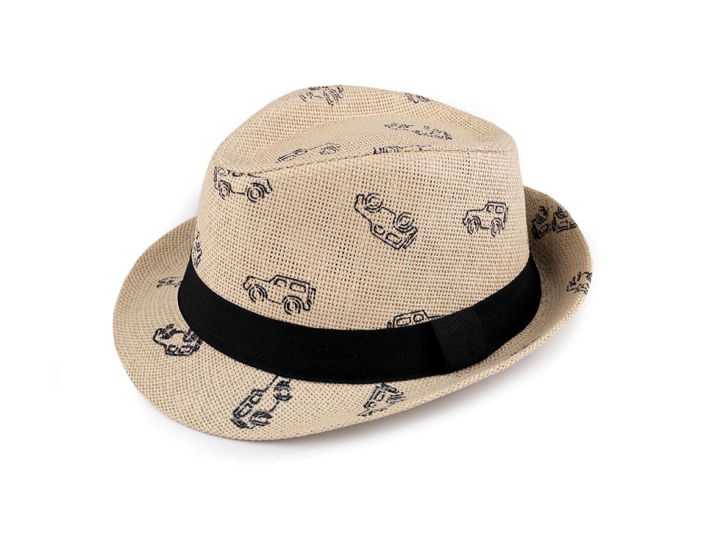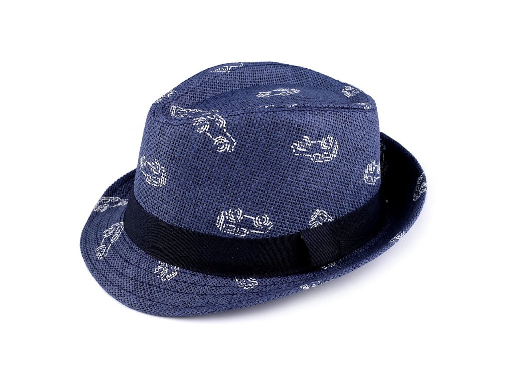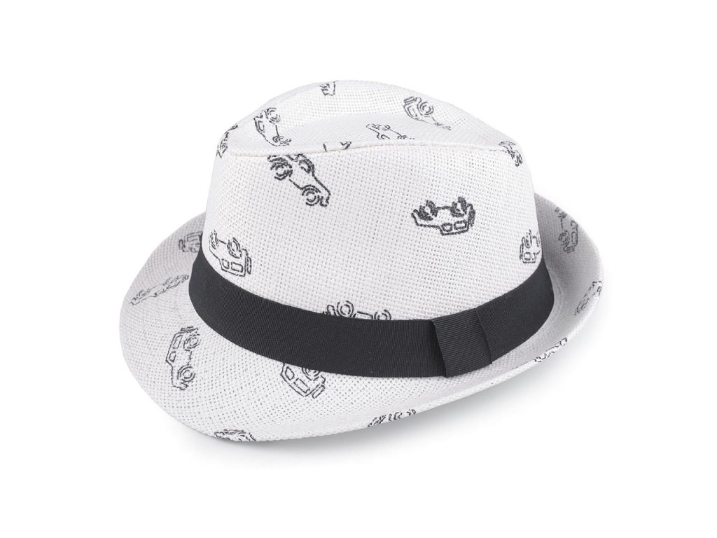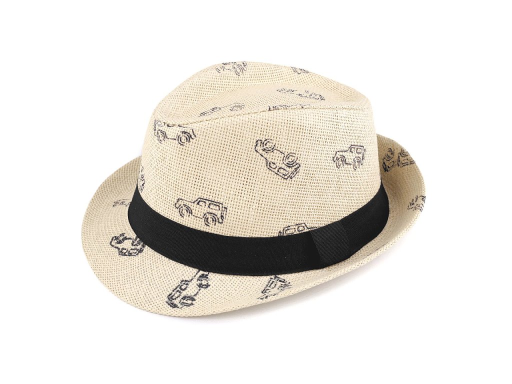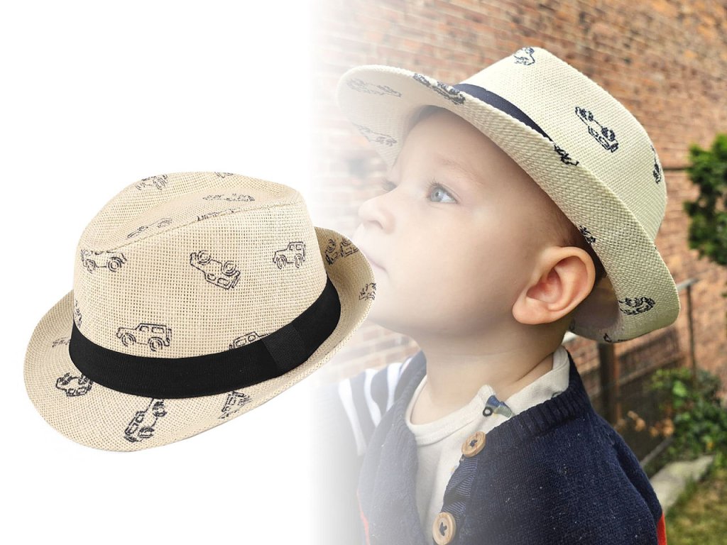 Letní dětský klobouk s potiskem autíček zdobí jednobarevná stuha. V teplých dnech klobouk skvěle ochrání před sluncem, je velmi lehký a prodyšný. Je velice oblíbený, děti rádi vypadají jako dospěláci, což jim klobouk typu Fedora umožní.