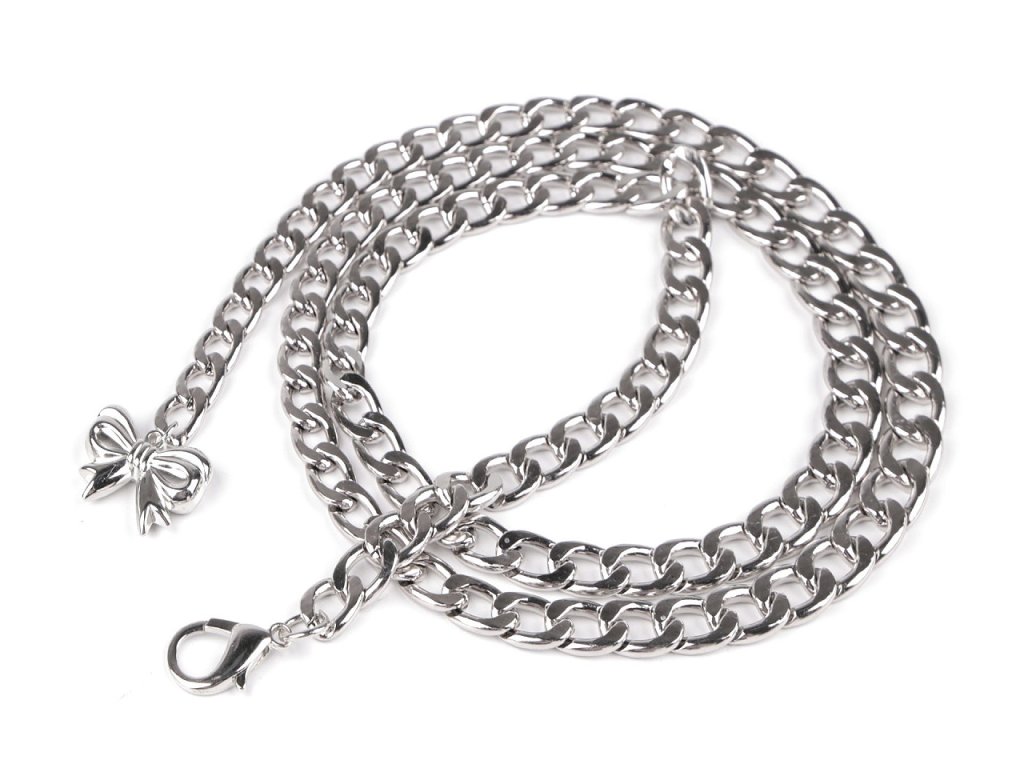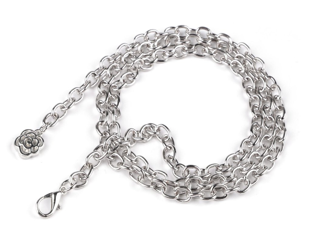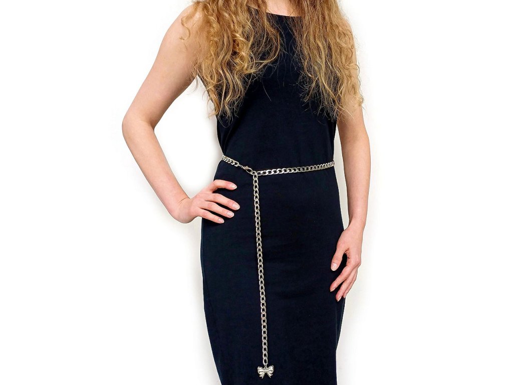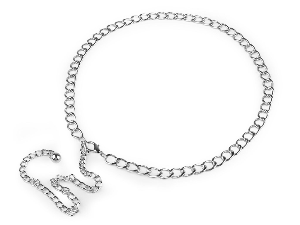 Dámský pásek z kovového řetízku je zajímavý módní doplněk. Jeden konec má ozdobený přívěskem, na druhém je karabina, díky které můžete pásek zapnout na potřebnou velikost. Pásek se hodí k šatům, tunikám apod.