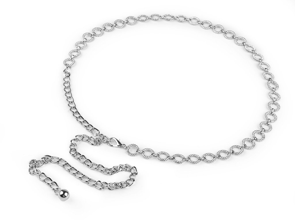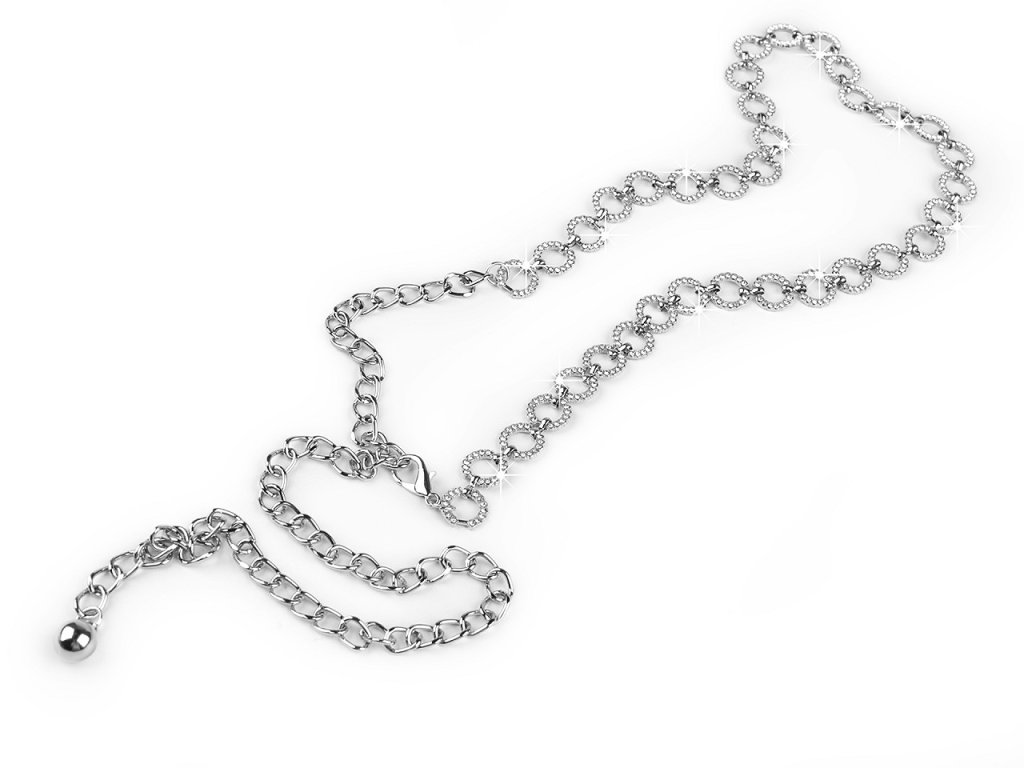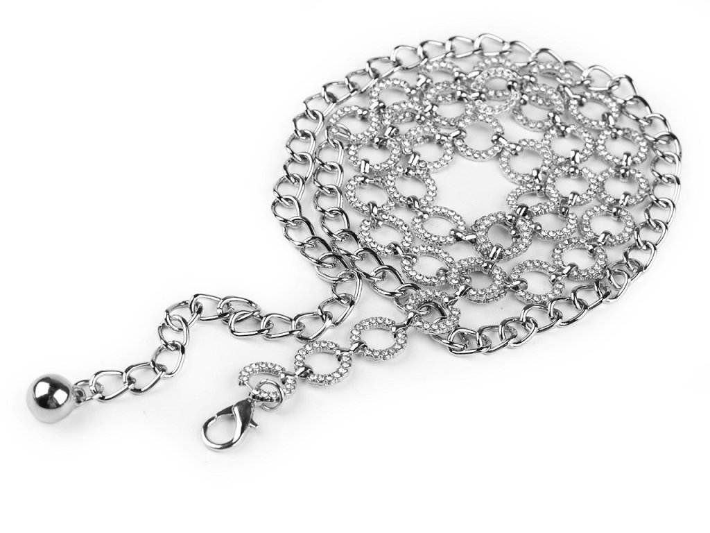 Dámský štrasový pásek bude patřit k elegantním kouskům ve vašem šatníku. Díky broušených kamínků se efektně třpytí. Jeden konec má ozdobený kovovou kuličkou, na druhém je karabina, díky které můžete pásek zapnout na potřebnou velikost. Pásek se hodí k šatům, tunikám apod.