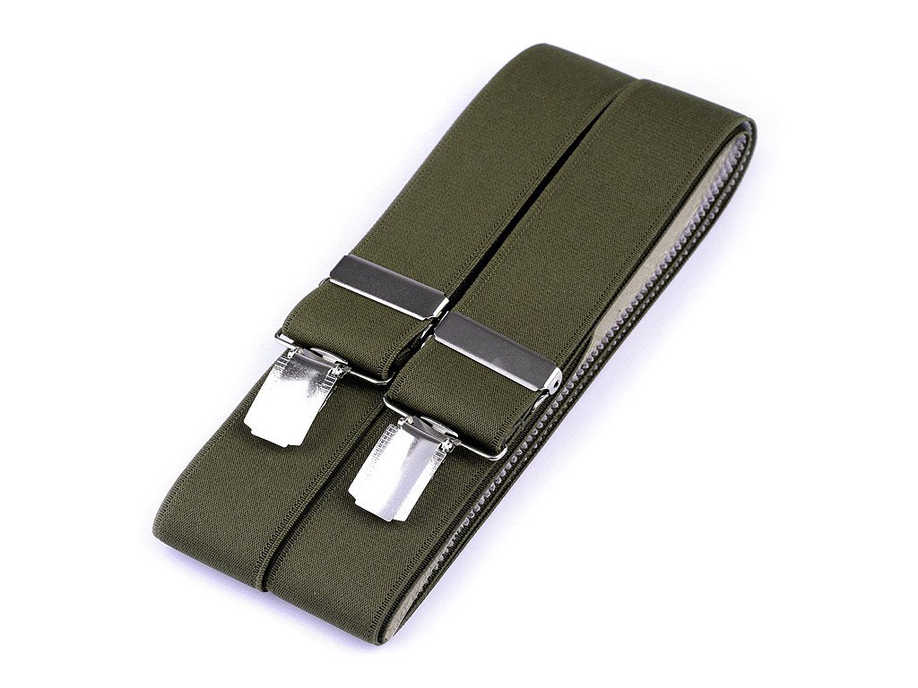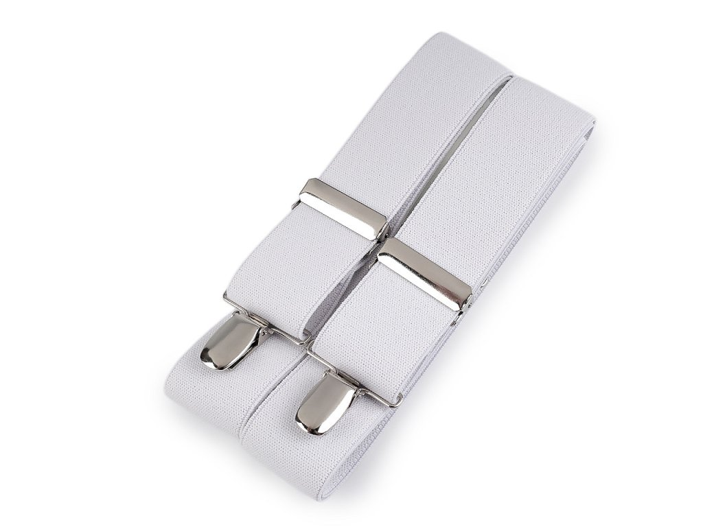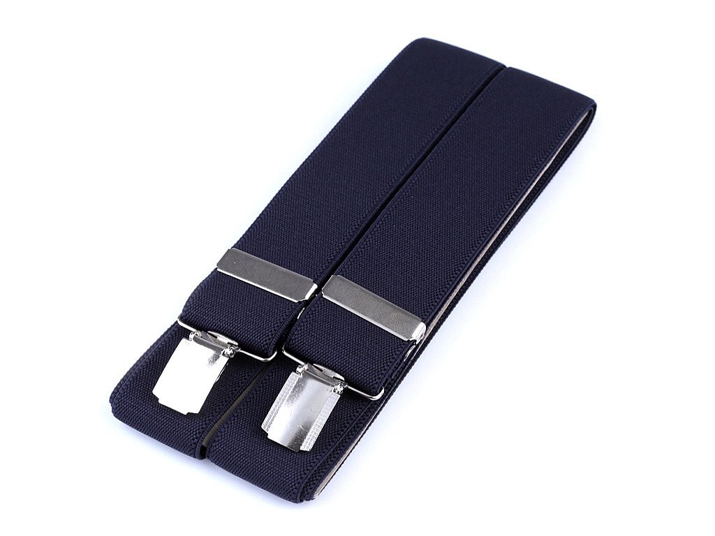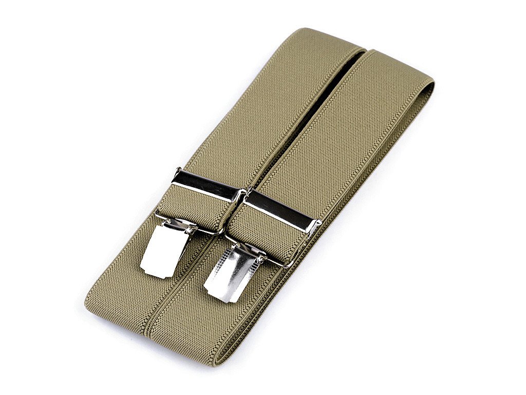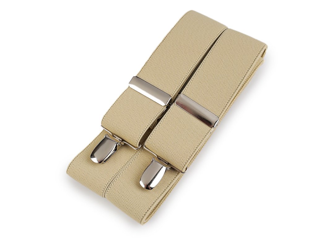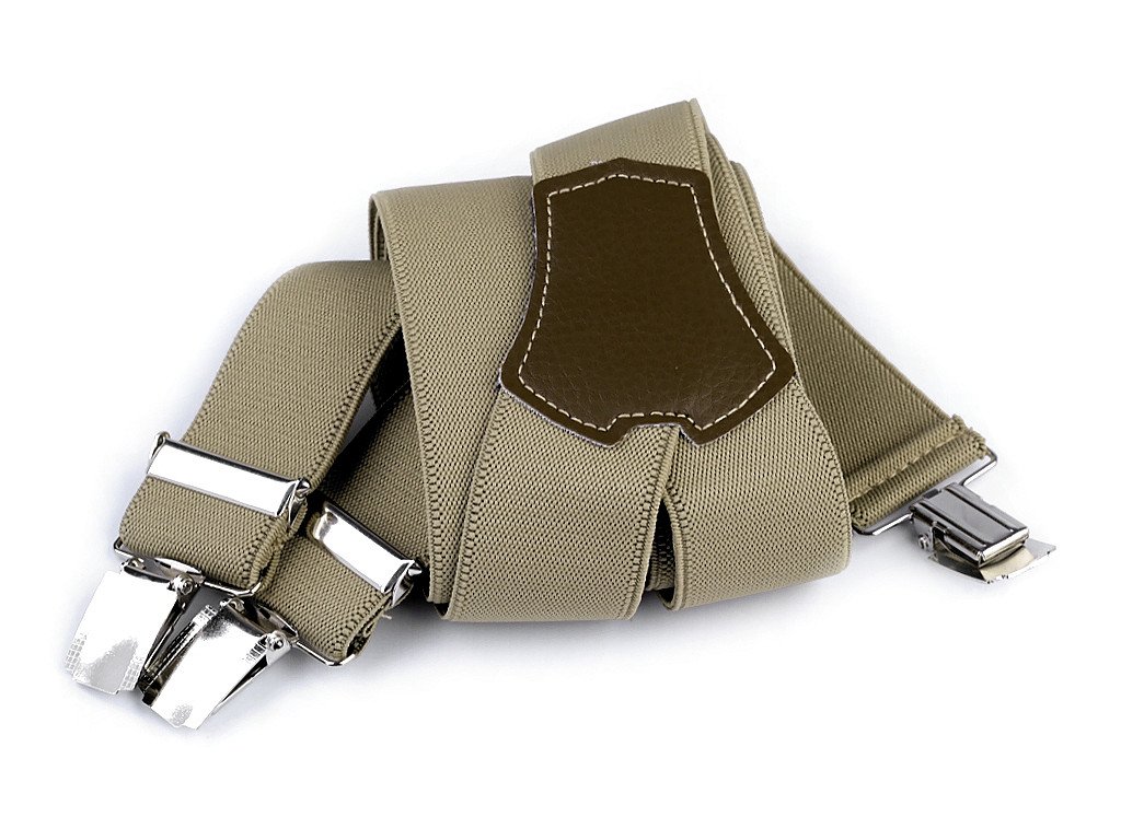 Jednobarevné šle jsou kvalitní české výroby. Elastický materiál umožňuje pohodlné nošení. Zadní vsadka z eko kůže jim dodává stylový vzhled. Ke kalhotám se upevňují na tři žabky - dvě vpředu a jednu vzadu.