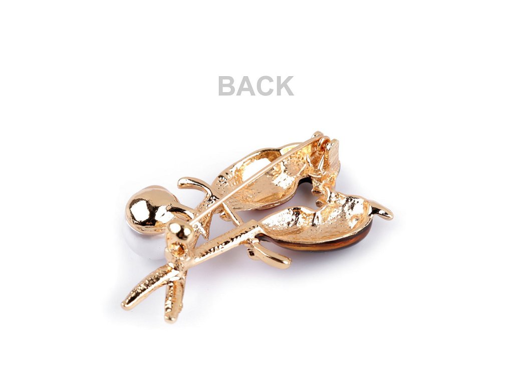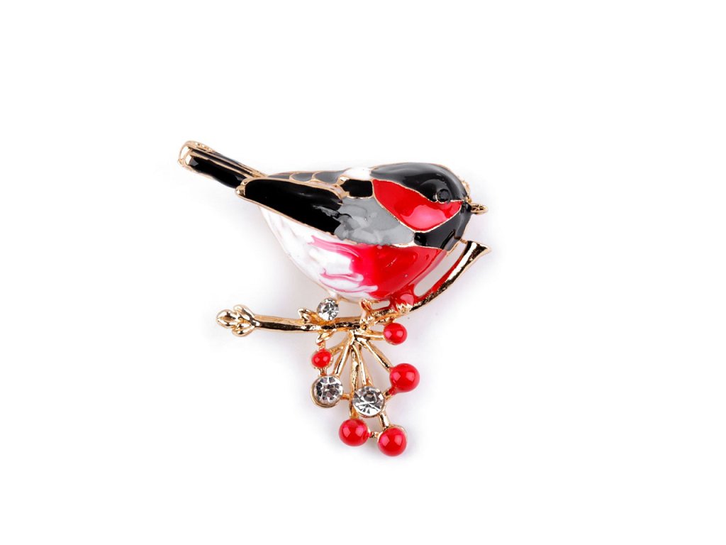 Brože č.3 a 4 - ptáček má větvičku ozdobenou broušenými kamínky.