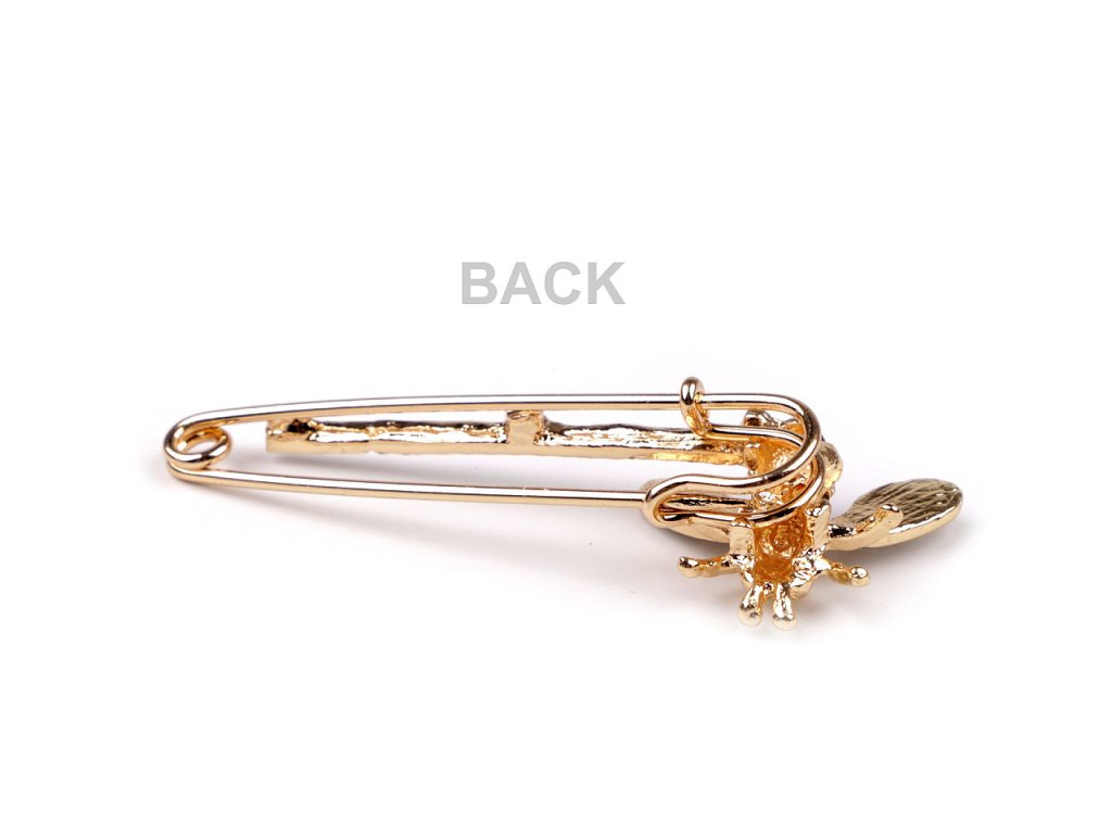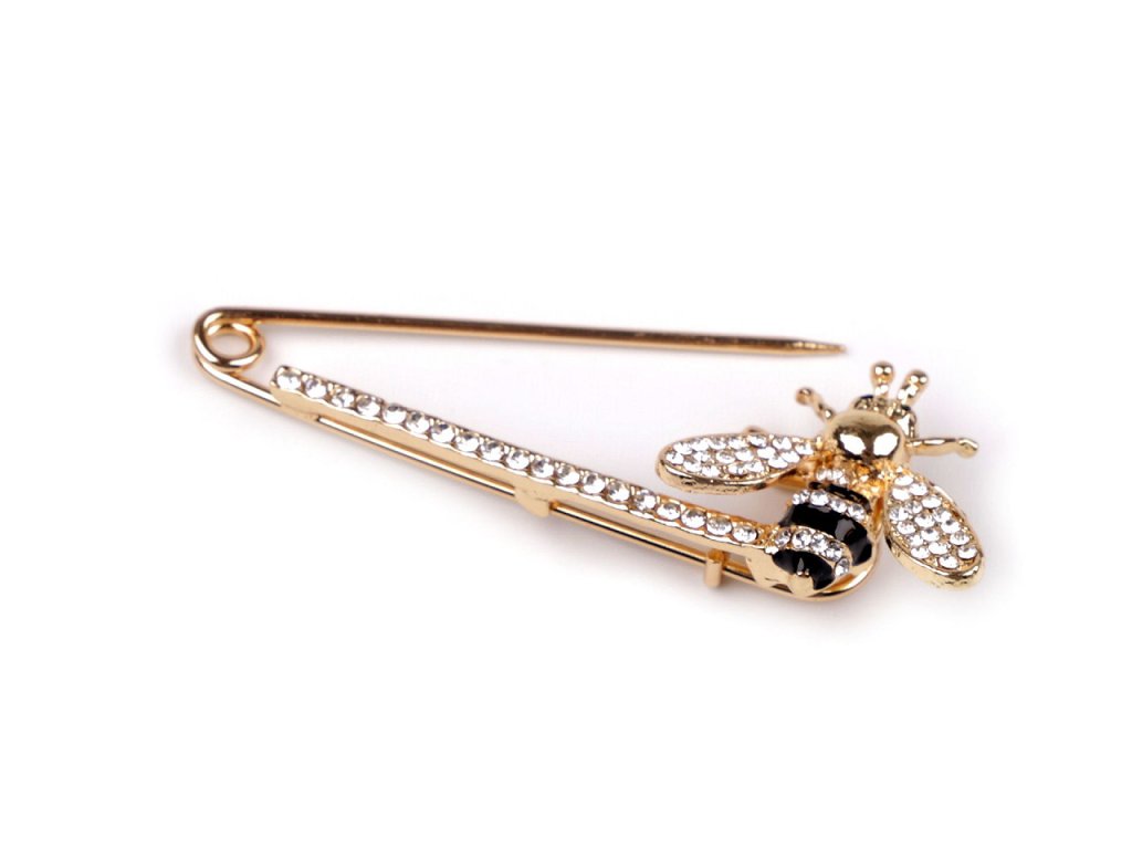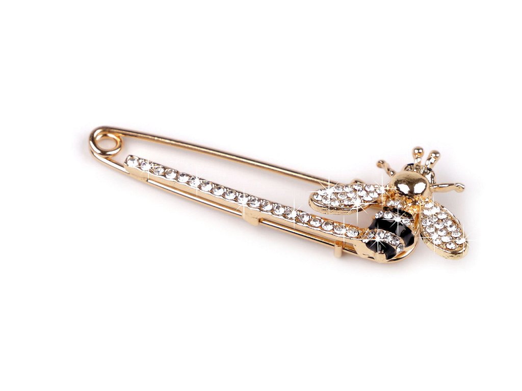 Brož na spínacím špendlíku zdobí včelka osázená broušenými kamínky. Vzhledem ke své tloušťce je vhodnější na pleteniny a podobné tkaniny, ne na jemné materiály.