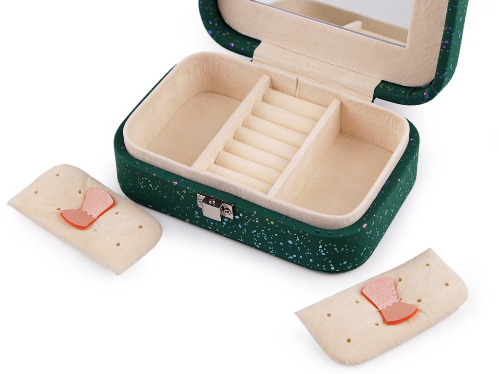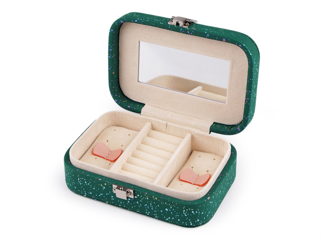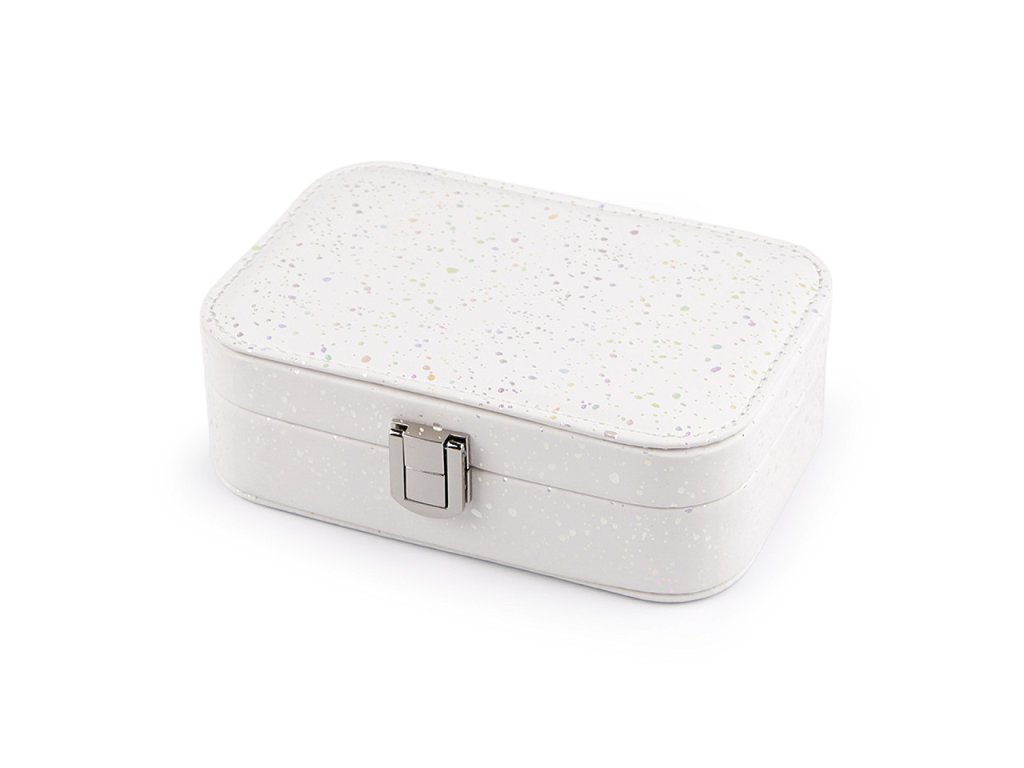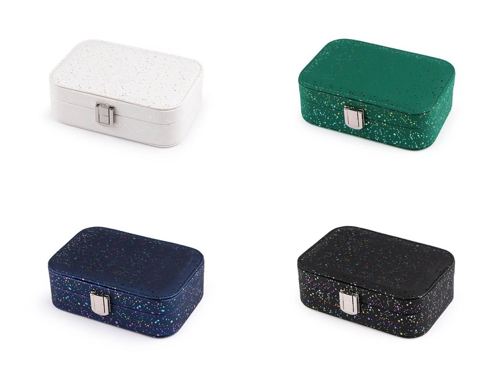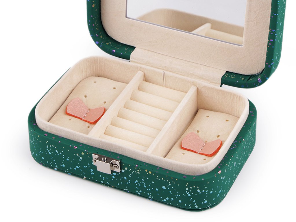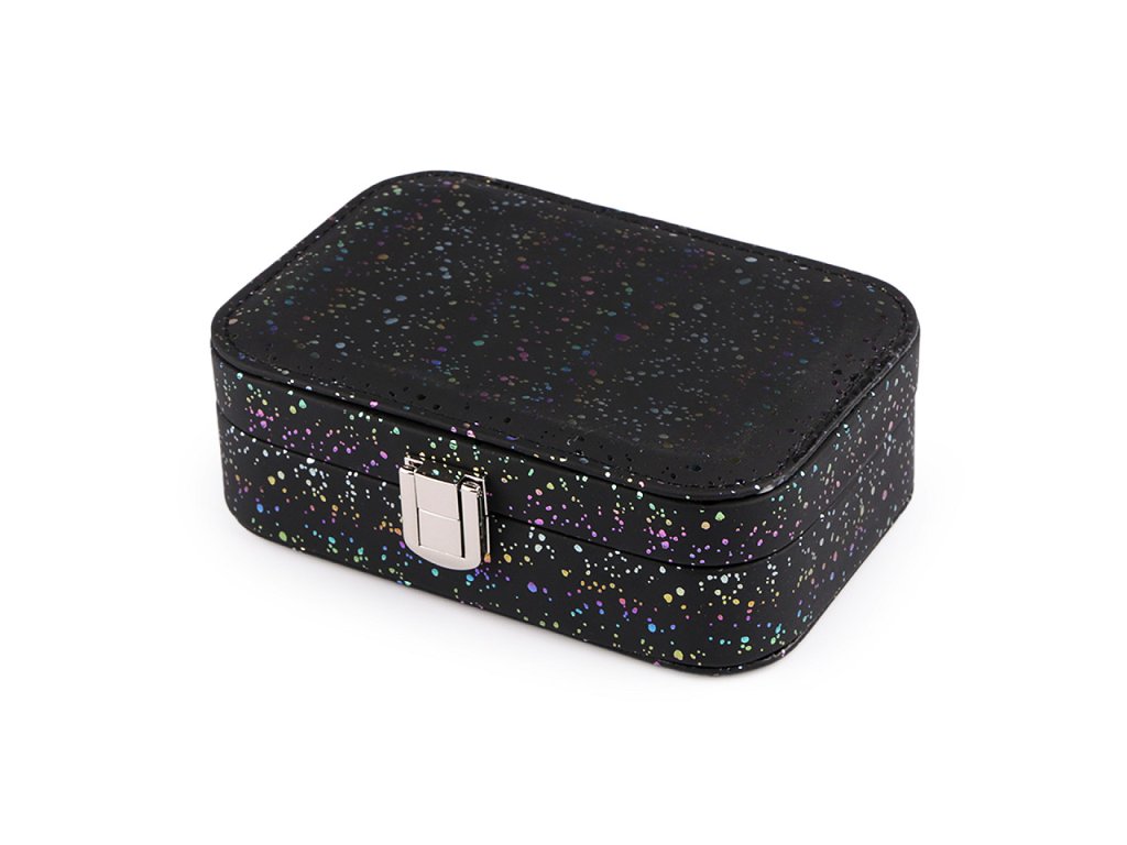 Malá šperkovnice má povrch posetý drobným metalickým potiskem, který se duhově leskne. Uzavírá se na kovové zapínání, spolehlivě ochrání šperky před nepříznivými vlivy okolí jako je světlo nebo vlhkost. Uvnitř šperkovnice jsou 2 přihrádky s polštářky na náušnice, oddíl na prsteny a zrcátko. Šperkovnice má velice kvalitní a precizní provedení.