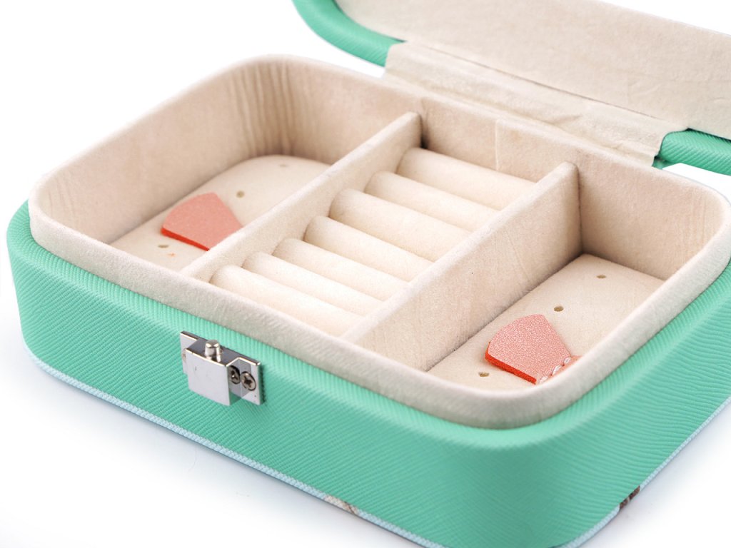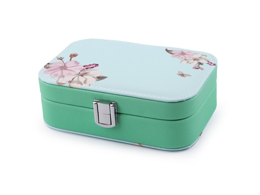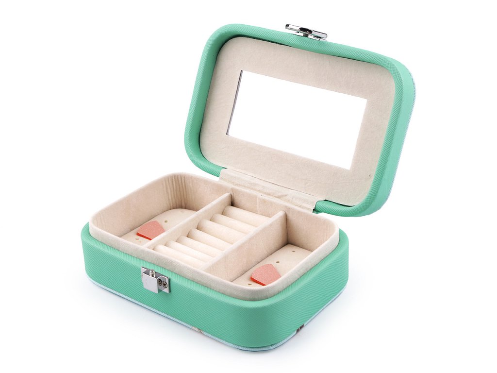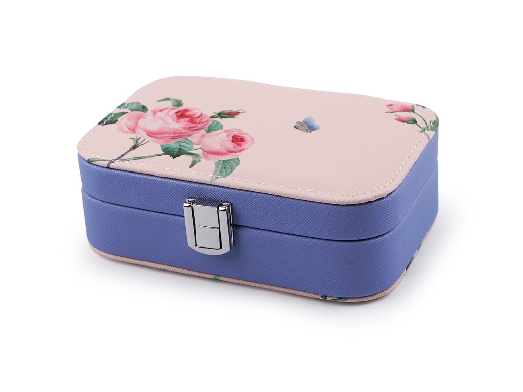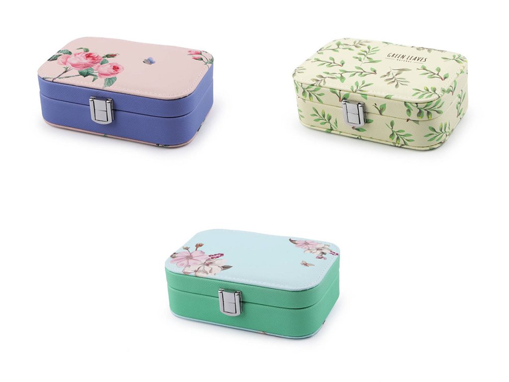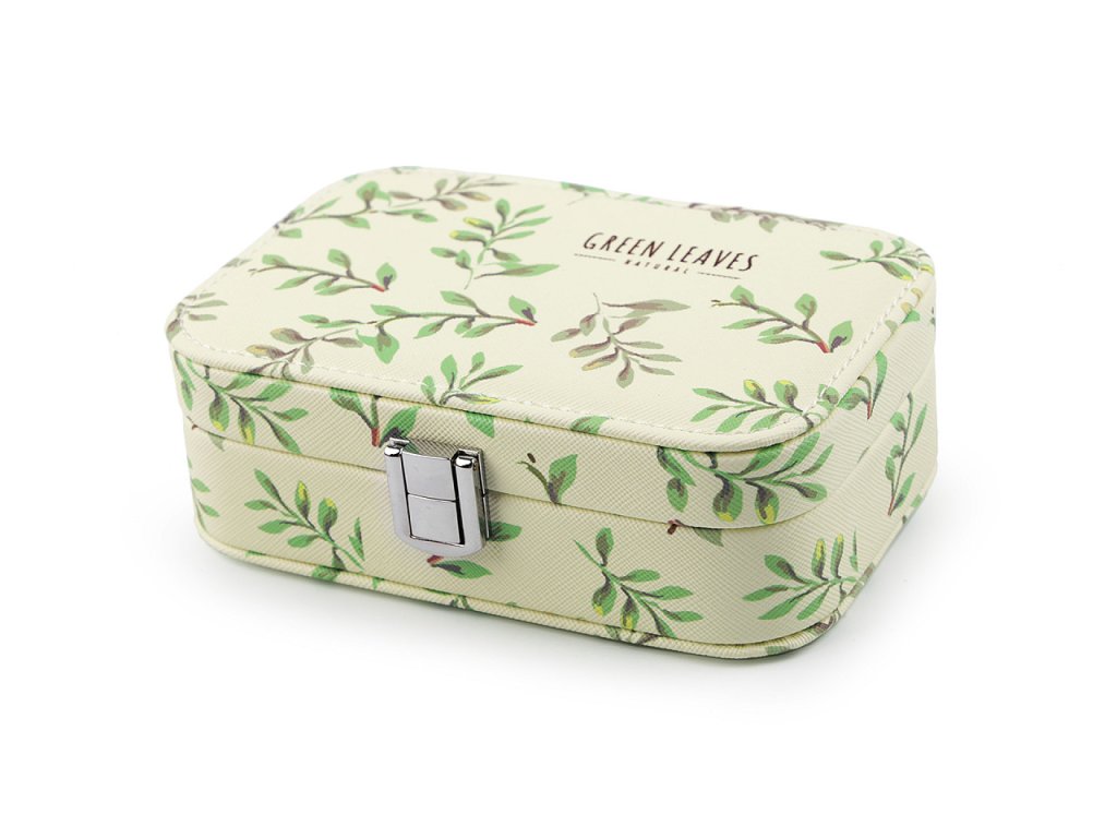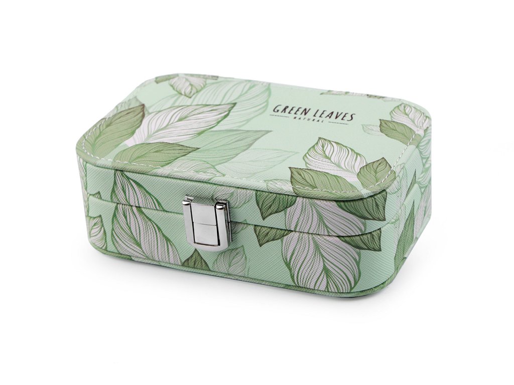 Malá šperkovnice s potiskem přírodních motivů má kovové zapínání, spolehlivě ochrání šperky před nepříznivými vlivy okolí jako je světlo nebo vlhkost. Uvnitř šperkovnice jsou 2 přihrádky s polštářky na náušnice, oddíl na prsteny a zrcátko. Šperkovnice má velice kvalitní a precizní provedení.