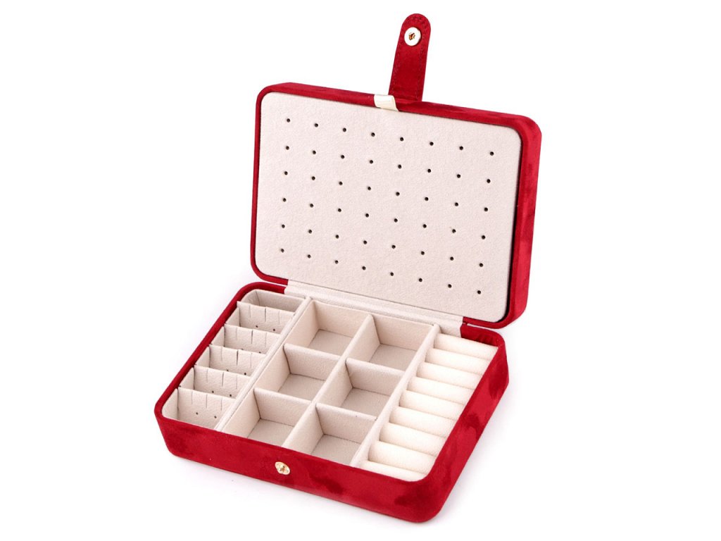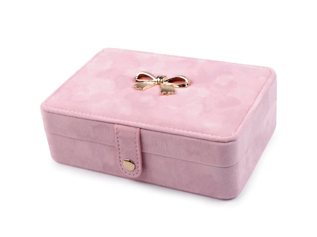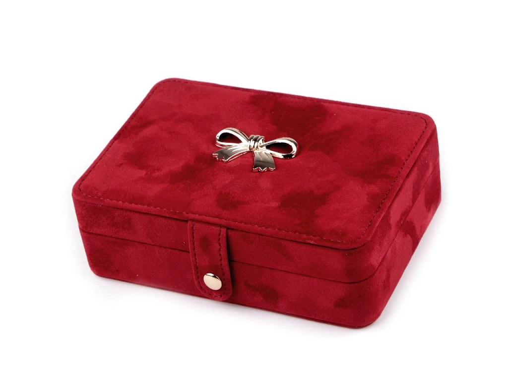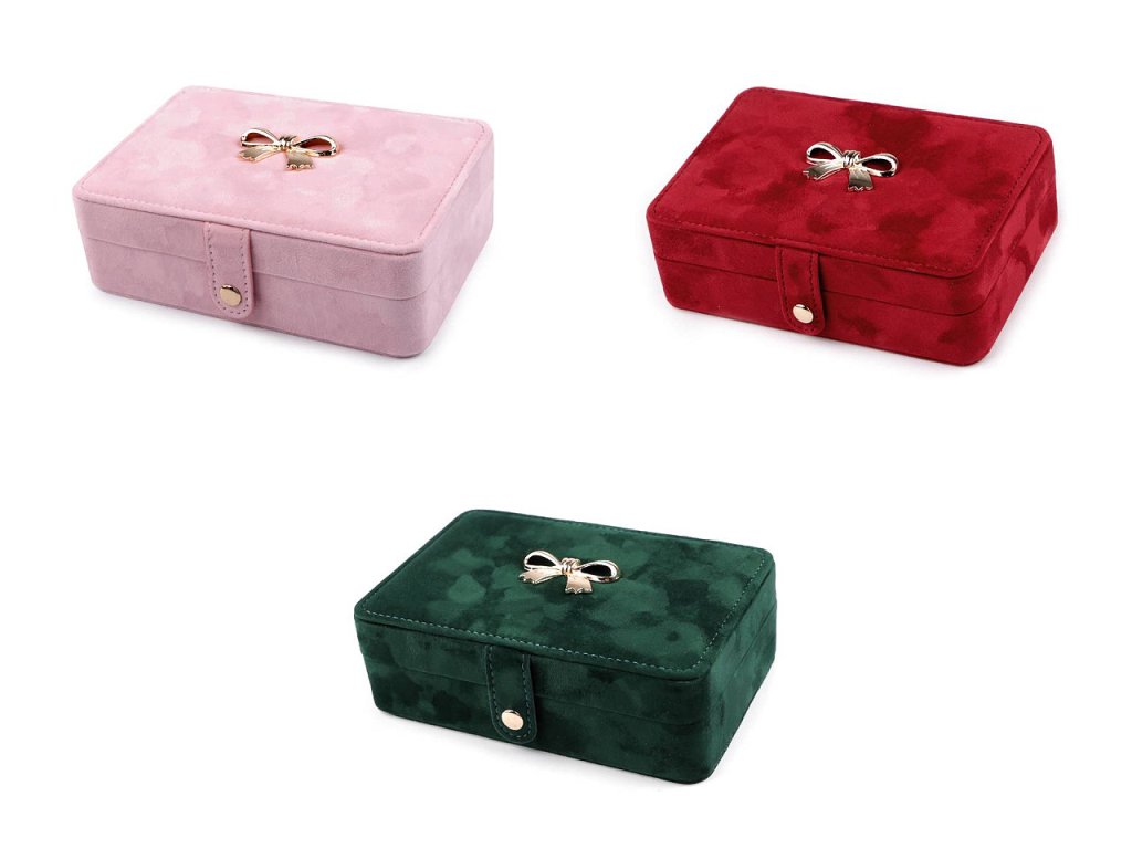 Malá semišová šperkovnice je ozdobená kovovou mašličkou. Má zapínání na patent, spolehlivě ochrání šperky před nepříznivými vlivy okolí jako je světlo nebo vlhkost. Uvnitř šperkovnice je přihrádka s odnímatelnými přepážkami, přihrádka s přepážkami na náušnice a oddíl na prsteny. Uprostřed je velká odklápěcí přepážka s otvory na umístění náušnic. Za ní, ve víku, je kapsa a háčky na umístění řetízků. Šperkovnice má velice kvalitní a precizní provedení.