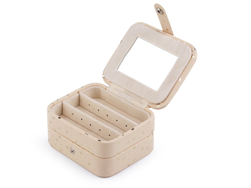 V horním patře najdete 3 přihrádky s odnímatelnými přepážkami na náušnice. Do dolního patra můžete odkládat prsteny, náušnice a jiné drobné šperky. V horním víku je umístěné zrcátko, v dolním 3 háčky. Šperkovnice má velice kvalitní a precizní provedení.