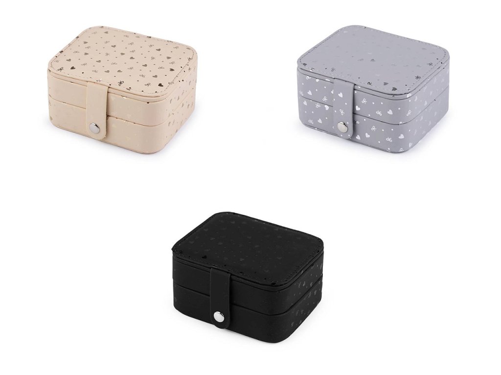 Malá šperkovnice se 2 patry má povrch ozdobený lesklým potiskem srdcí a mašliček. Disponuje velkým množstvím úložného prostoru. Zapínání na patent, spolehlivě sepne obě patra dohromady. Je perfektní na doma i na cestování.