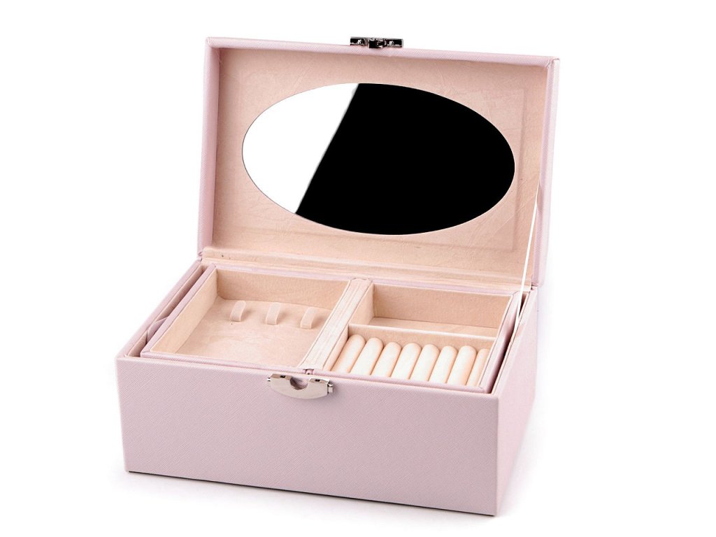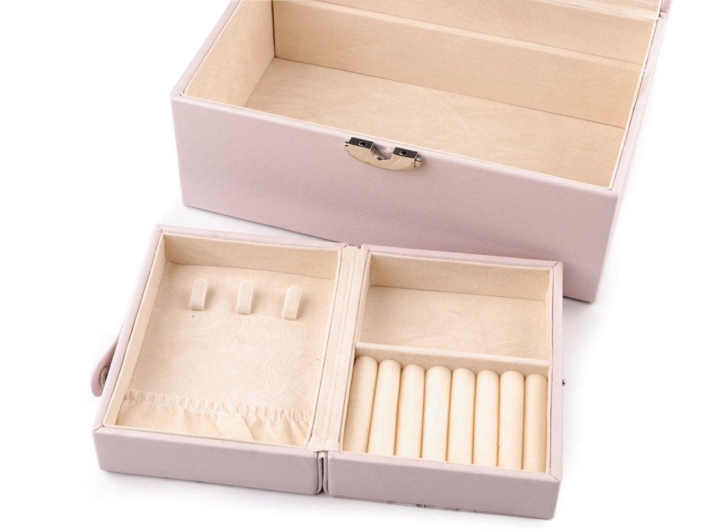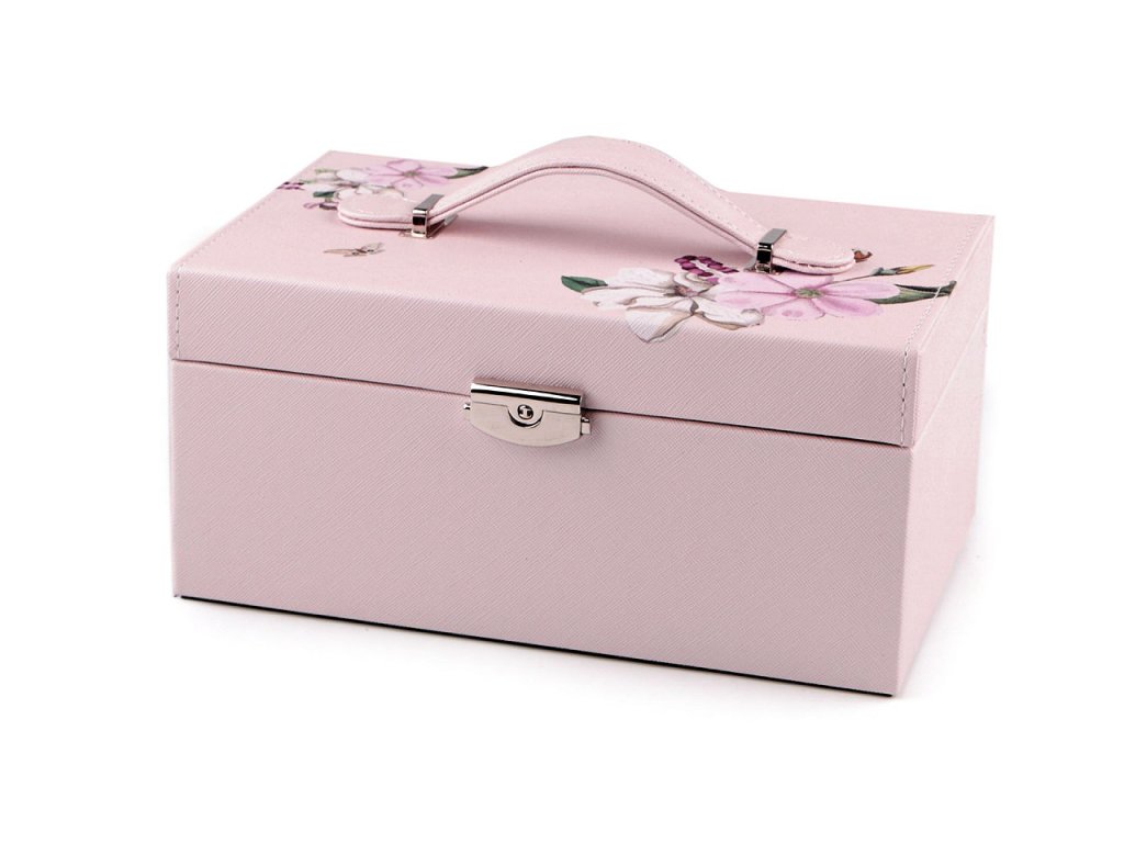 Uzamykatelná šperkovnice se zrcátkem je ozdobená potiskem květů. Kovové, mechanické zapínání spolehlivě ochrání šperky před světlem nebo vlhkostí. Díky uchu ji můžete pohodlně přenášet. Uvnitř je šperkovnice velice zajímavá. Horní patro můžete odejmout a samostatně jej zavřít do malé cestovní krabičky. Je v něm 1 přihrádka, 1 oddíl na prsteny a 1 velká přihrádka s kapsičkou a háčky.