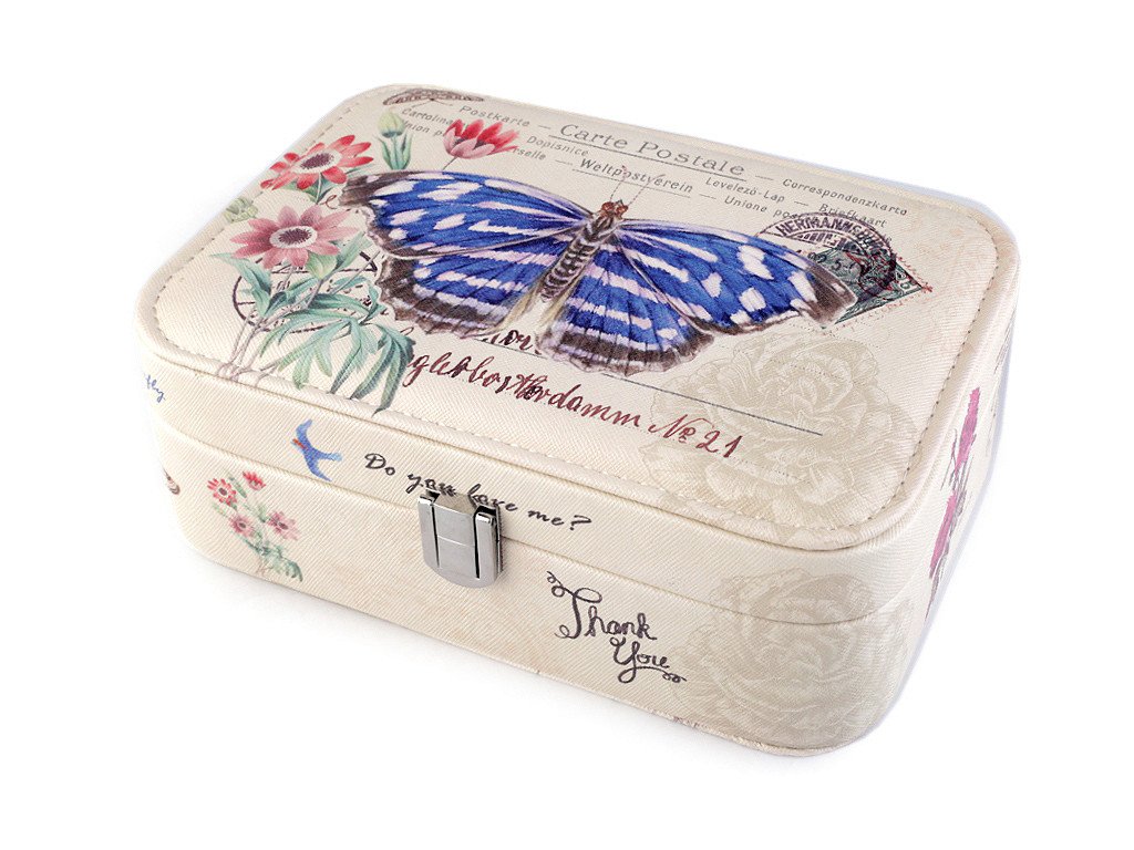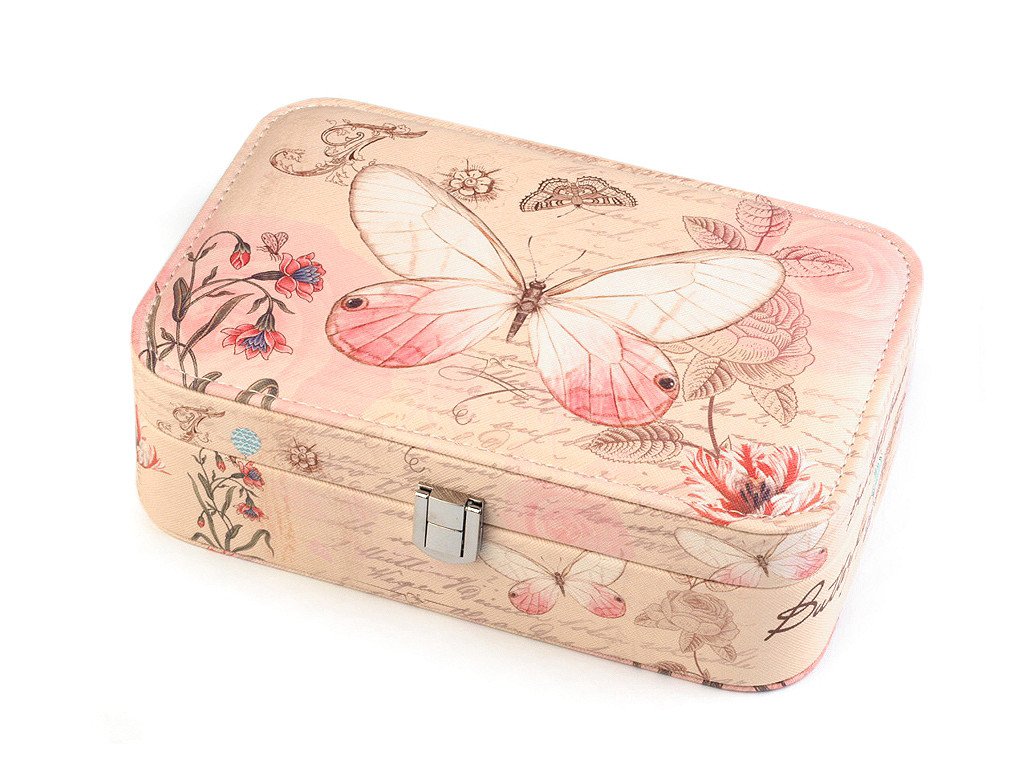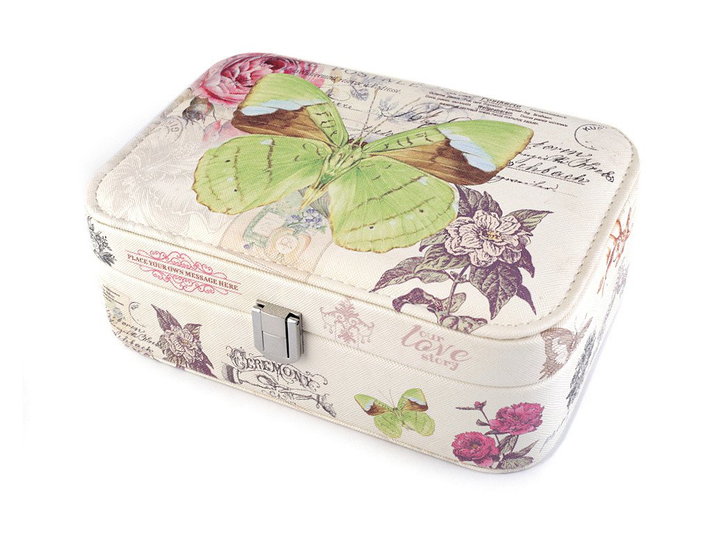 Elegantní provedení z eko kůže s potiskem motýlů jako ze starého atlasu nadchne každou ženu. Šperkovnice působí vintage dojmem, má kovové zapínání. Ochrání vaše šperky před nepříznivými vlivy okolí, jako je světlo nebo vlhkost.