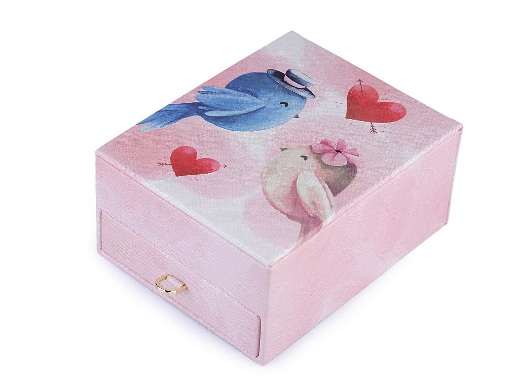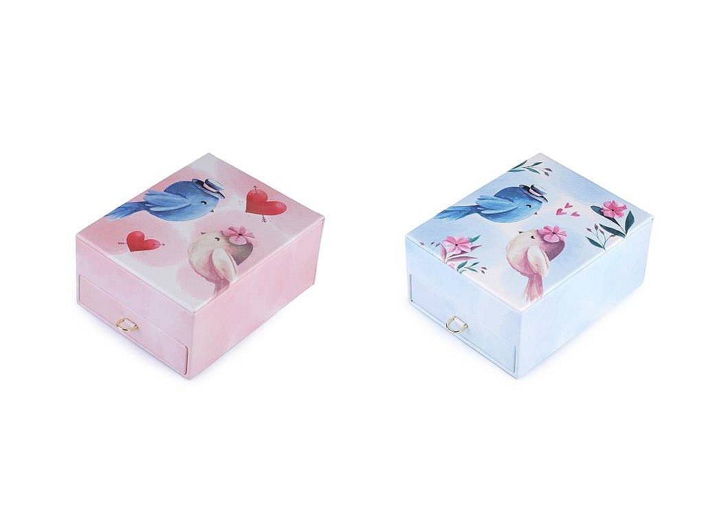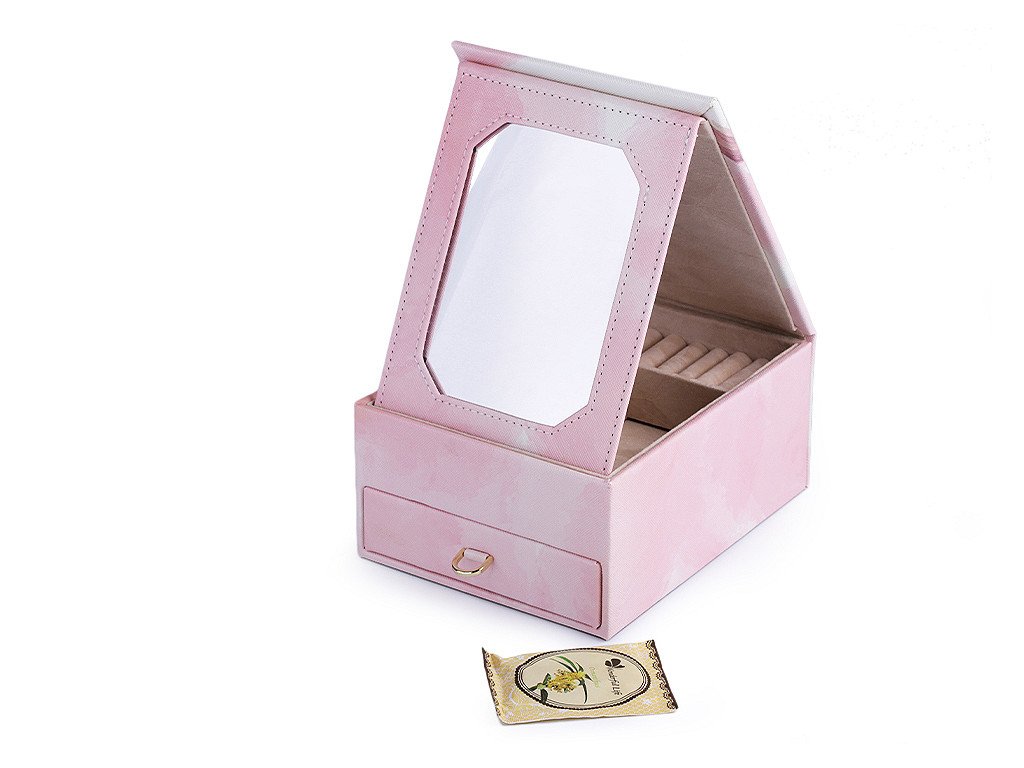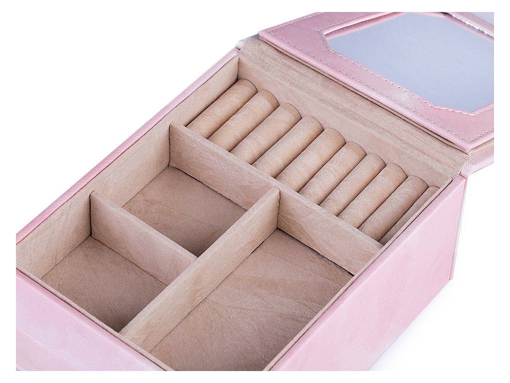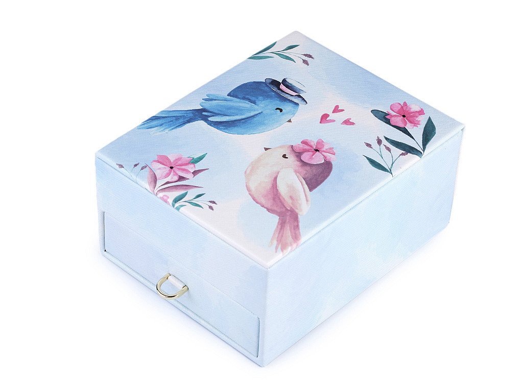 Šperkovnice s romantickým potiskem ptáčků spolehlivě ochrání šperky před nepříznivými vlivy okolí jako je světlo nebo vlhkost. Nahoře má odklápěcí víko se zrcadlem, ve spodní části je dlouhý šuplík. Pod víkem jsou 2 malé a velká přihrádka a oddíl na prsteny. Zrcadlo je odklápěcí, můžete ho pomocí přední hrany postavit (viz foto). Šperkovnice má velice kvalitní a precizní provedení.