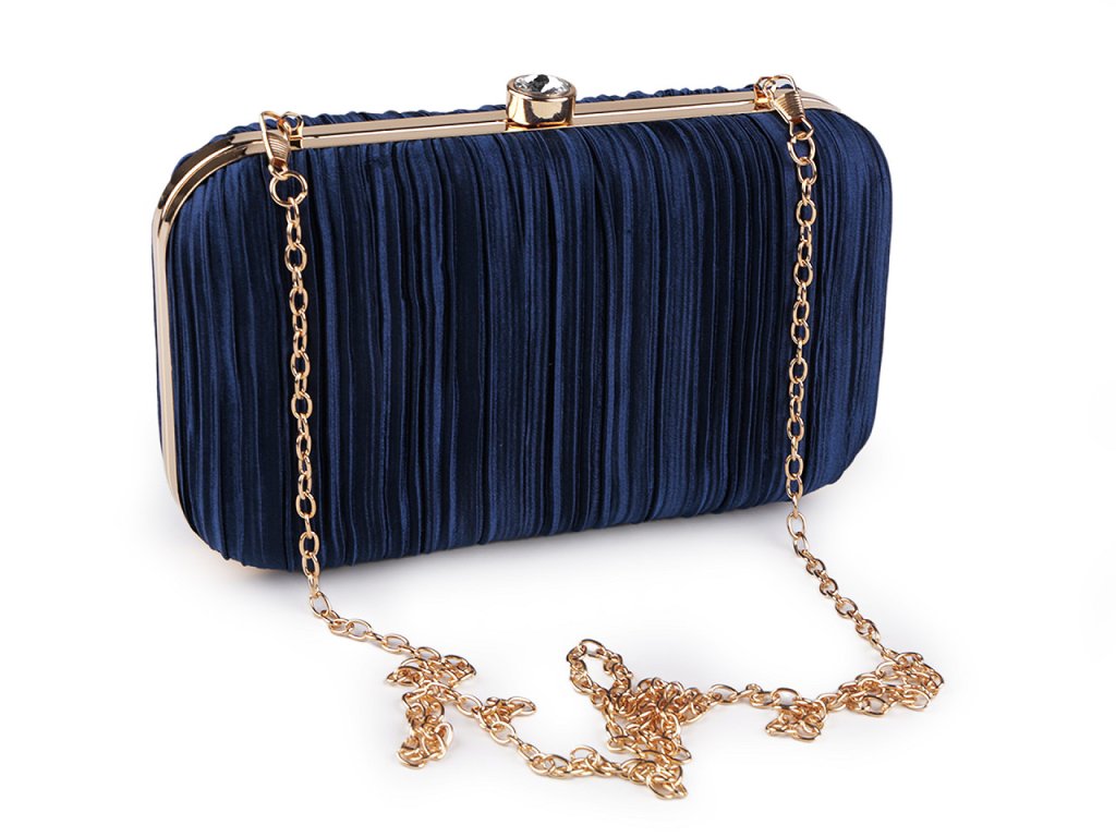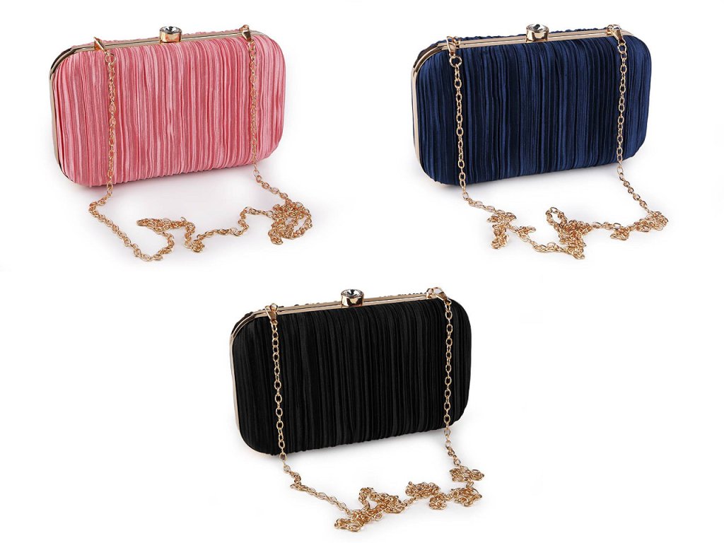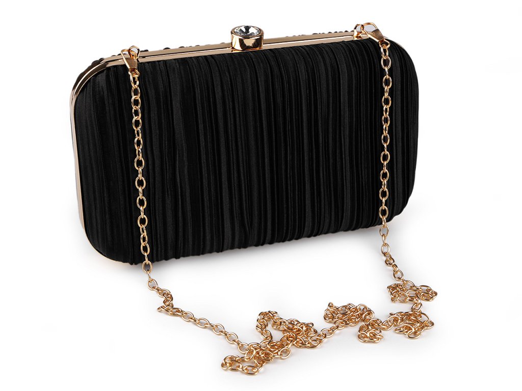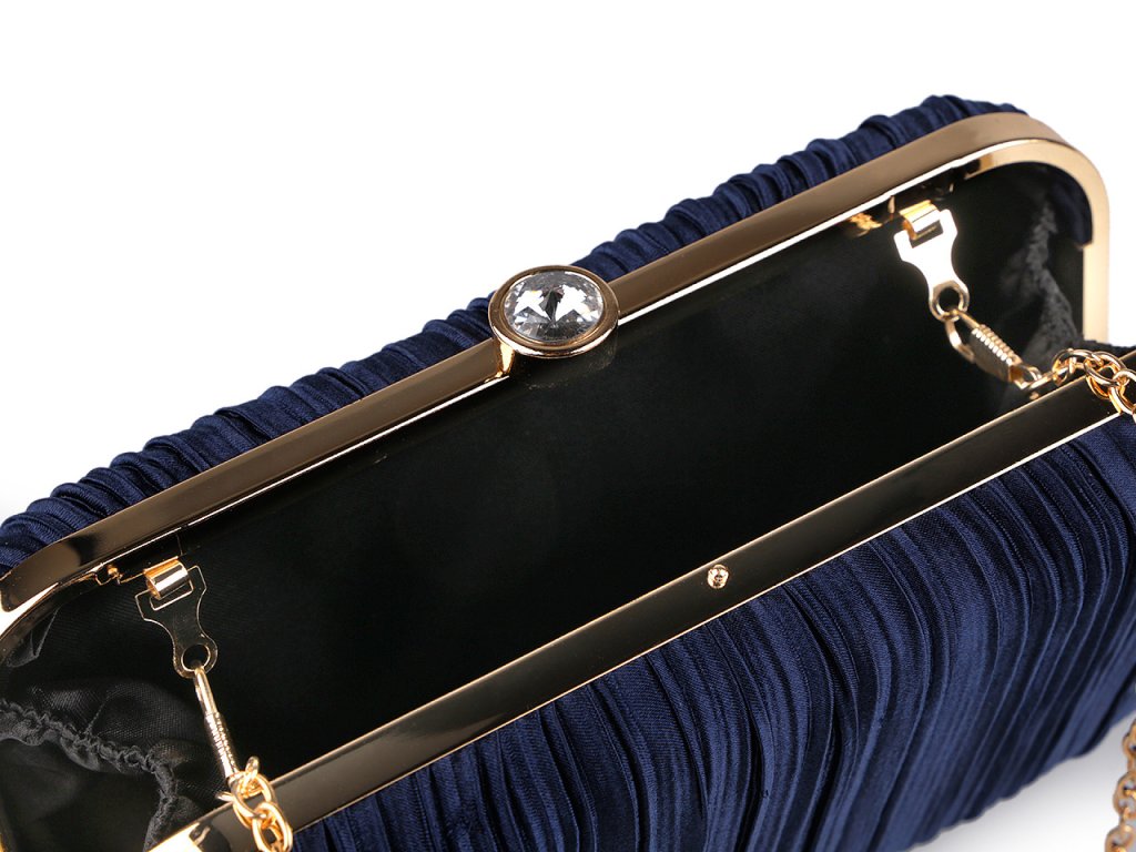 Luxusní společenská kabelka je skvělým doplňkem pro každou příležitost, kdy chcete vypadat stylově a elegantně. Zdobí ji textilní nařasený povrch s jemným leskem a výrazné lesklé zapínání ve tvaru vsazeného broušeného kamene. Kabelka je pevně vyztužená, skořepinová, po celém obvodu má kovový rámeček. Její součástí je dlouhý odnímatelný řetízek na karabiny. Můžete ji nosit v ruce nebo jako crossbody přes rameno či do kříže.