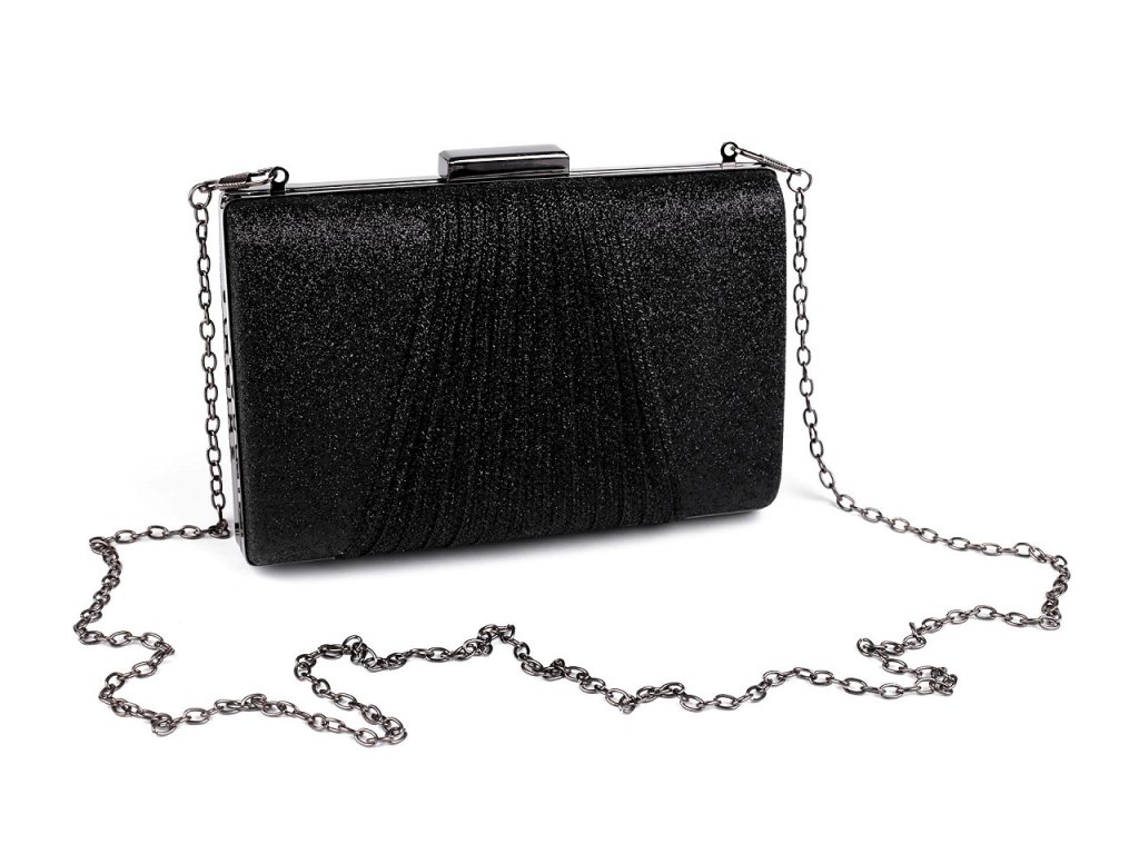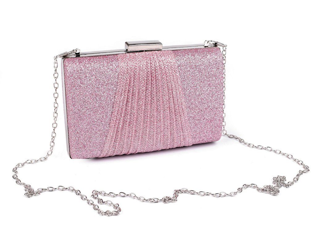 Malá společenská kabelka vyzařuje eleganci a luxus, díky glitrům se třpytí. Na přední straně je ozdobená zřasenou tkaninou. Kabelka má po celém obvodu kovový rámeček. Je pevně vyztužená, její součástí je dlouhý odnímatelný řetízek na karabiny.