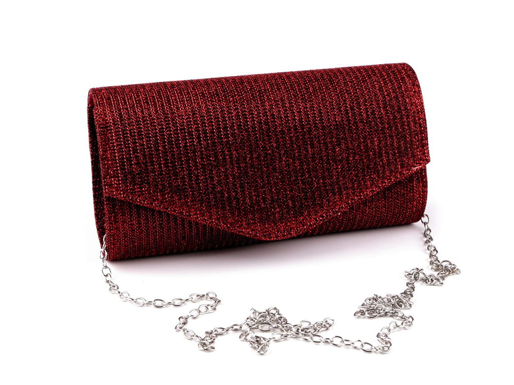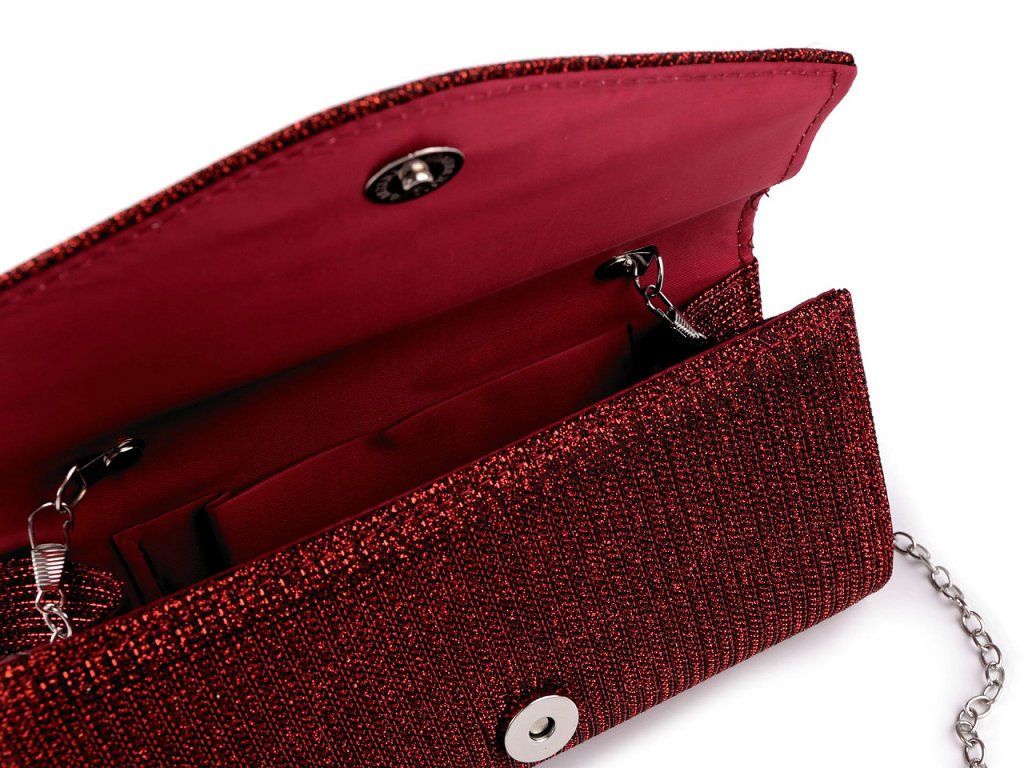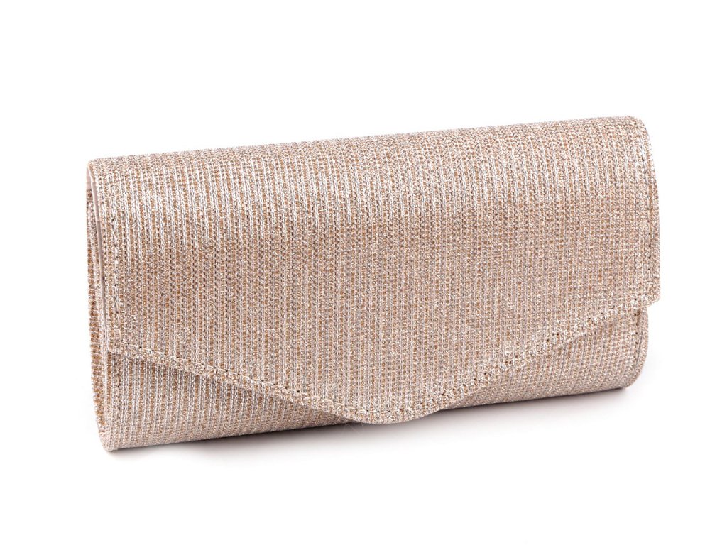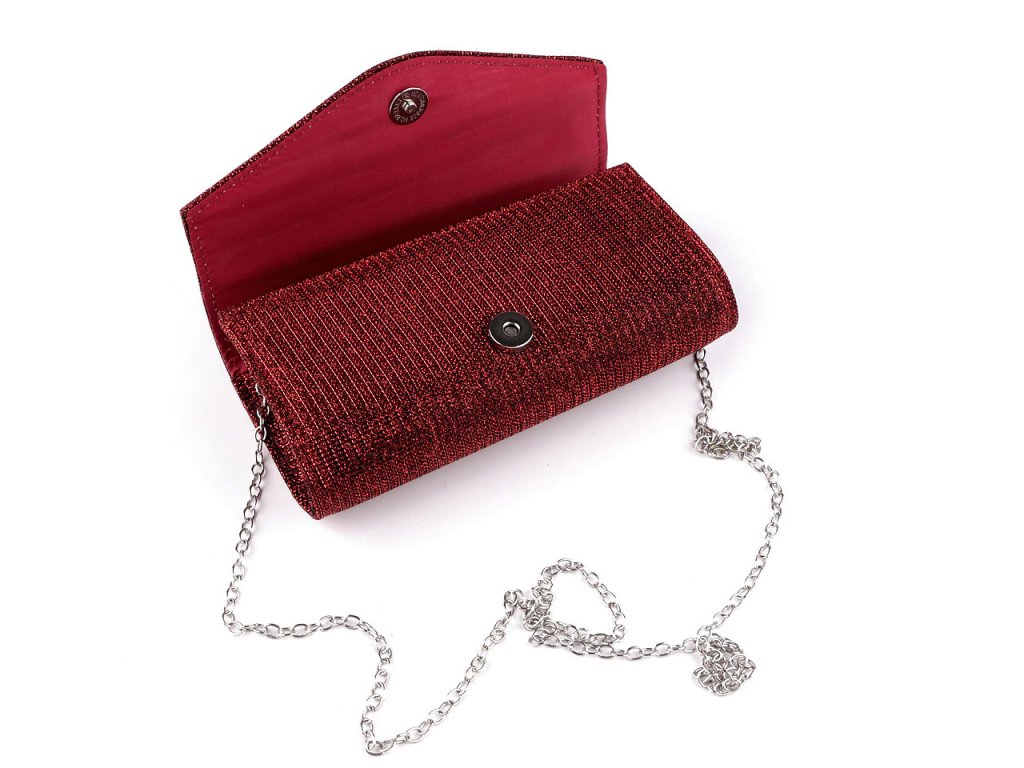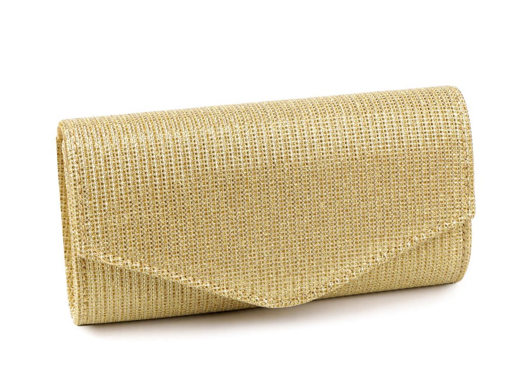 Malá společenská kabelka psaníčko vyzařuje eleganci a luxus, díky lurexu se třpytí. Na každé společenské události budete nepřehlédnutelná. Psaníčko je vyztužené, uvnitř má polyesterovou podšívku a malou kapsičku na drobnosti. Součástí je také odnímatelný kovový řetízek.