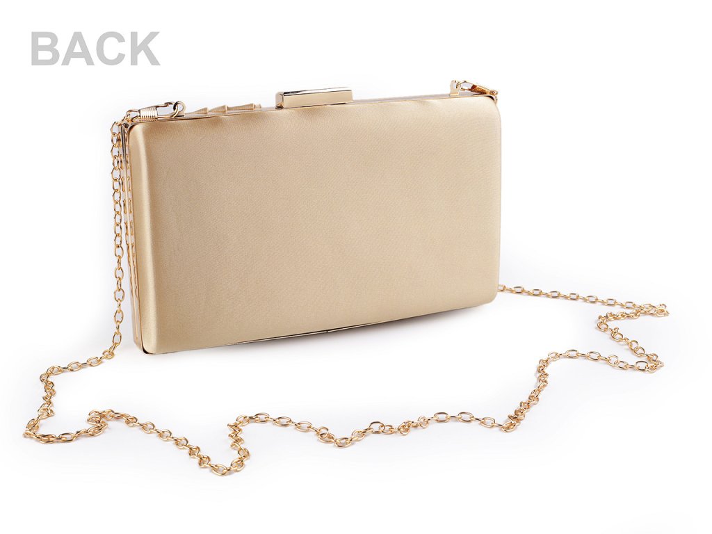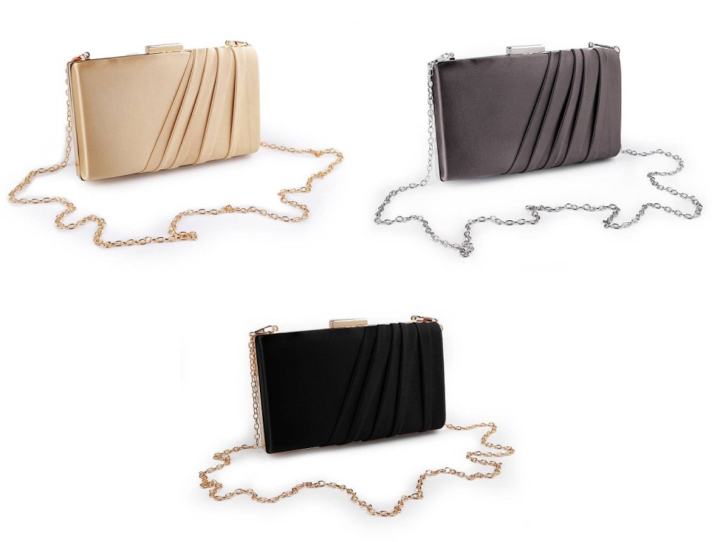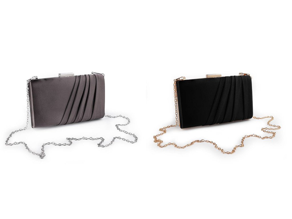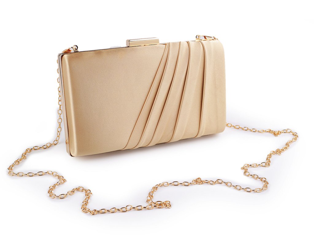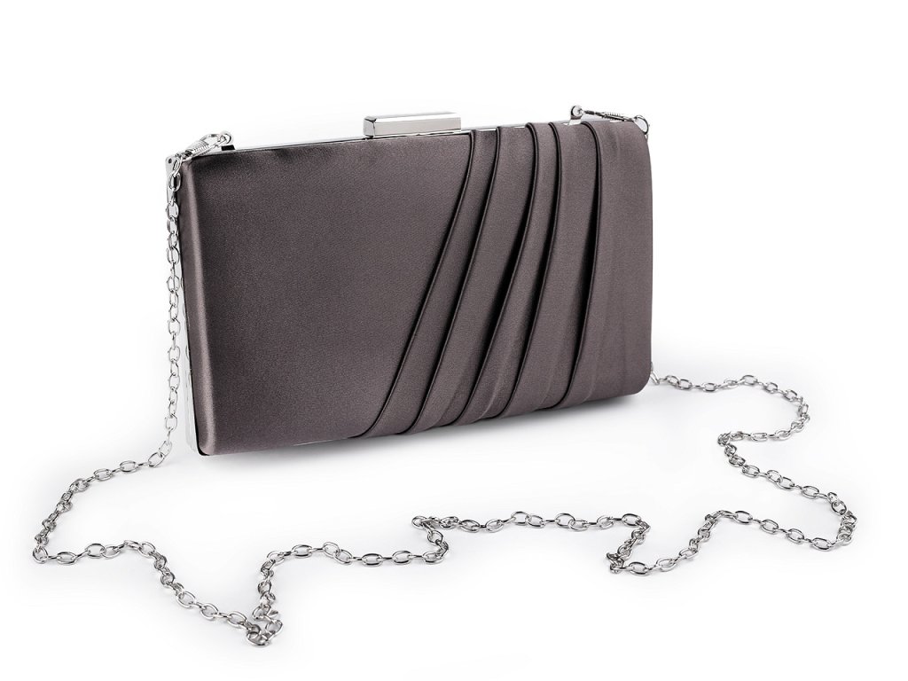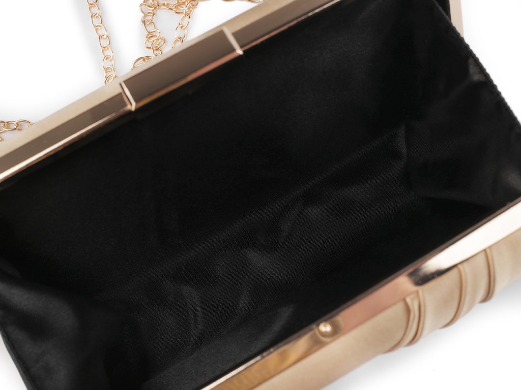 Malá společenská kabelka vyzařuje eleganci a luxus. Její povrch má saténový lesk. Na přední straně je ozdobená zřasenou tkaninou. Kabelka má po celém obvodu kovový rámeček. Je pevně vyztužená, její součástí je dlouhý odnímatelný řetízek na karabiny.