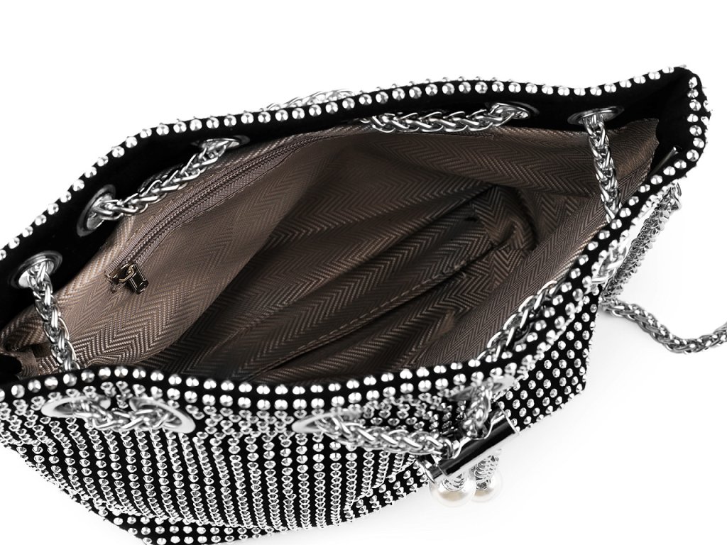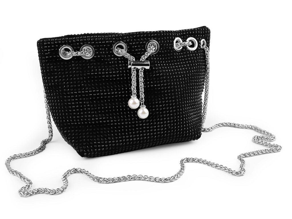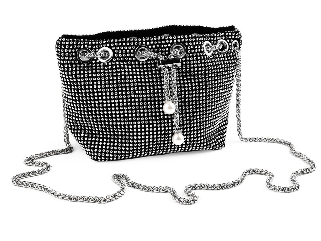 Elegantní stahovací kabelka ozdobená broušenými kamínky se efektně třpytí. Uzavírá se pomocí kovového řetízku s brzdičkou, konce řetízku jsou ozdobené velkými perlami. Navzdory své malé velikosti je kabelka díky rozšířenému dnu velice prostorná, vejde se do ní mobil, peněženka, klíče, kapesníky i drobná kosmetika. Uvnitř má kapsičku na zip. Součástí kabelky je kulatý odnímatelný řetízek, můžete ji nosit přes rameno nebo křížem jako crossbody nebo jen tak v ruce.