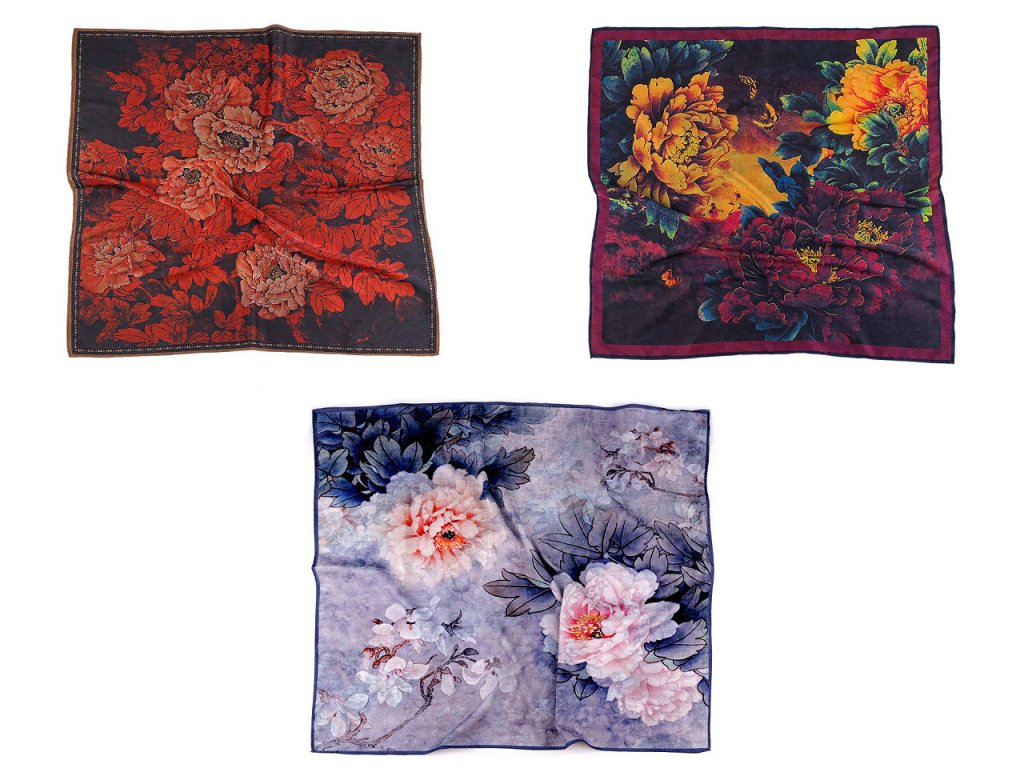 Šátky jsou oboustranné, ale některé mohou mít zadní stranu jednobarevnou, s jemným ornamentálním vzorem tón v tónu.