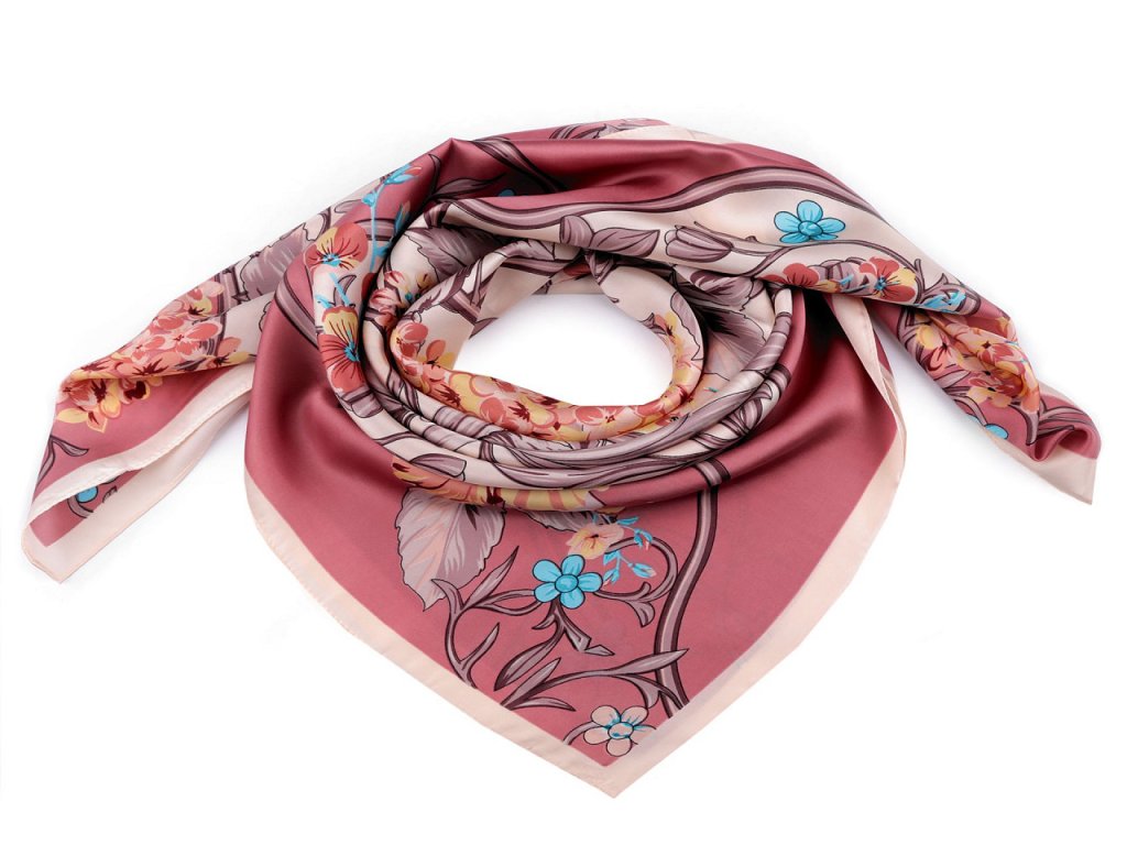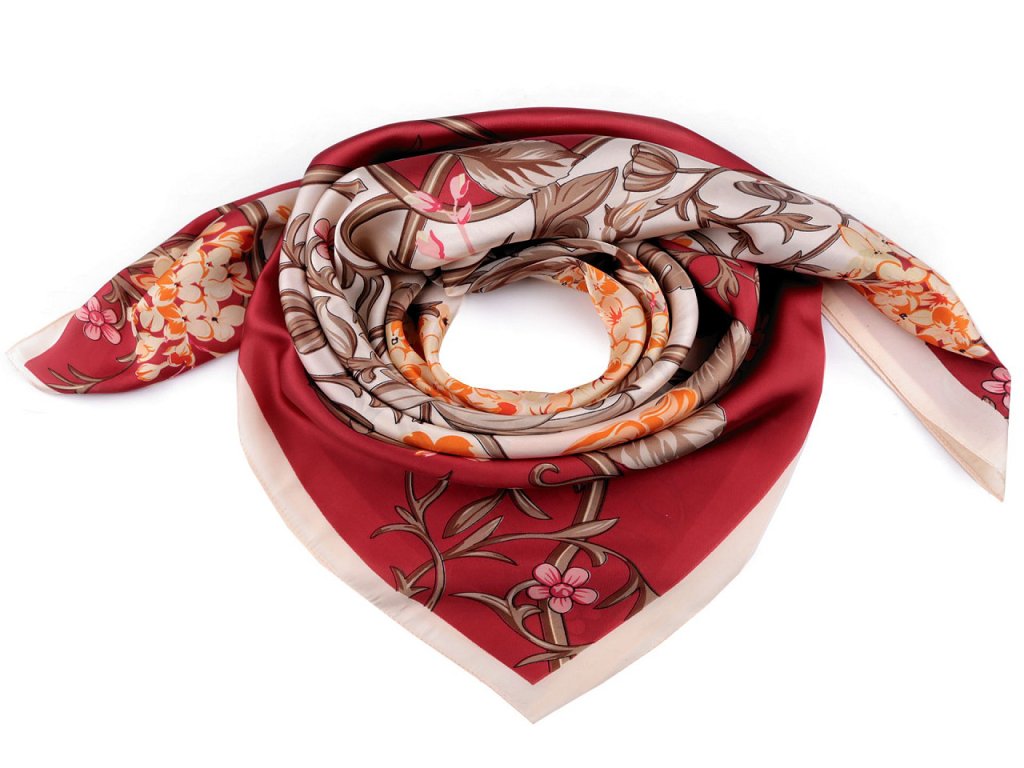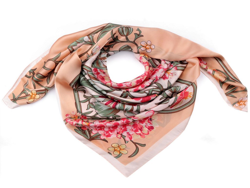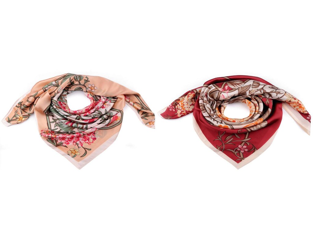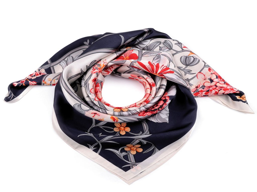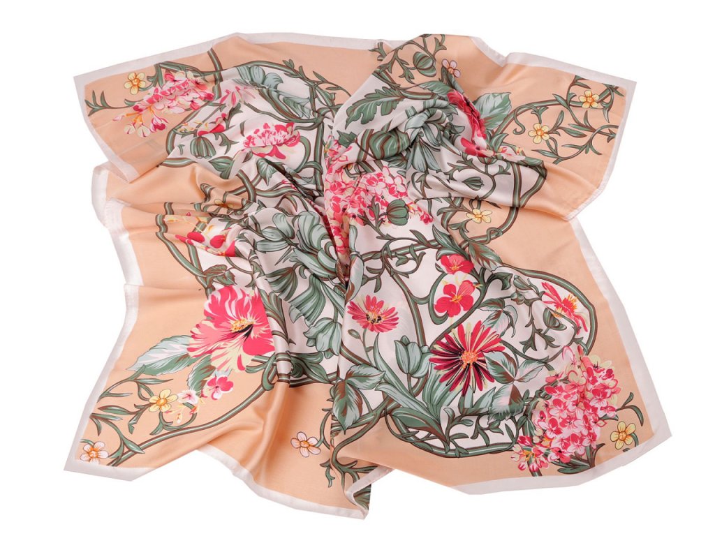 Saténový šátek s bohatou záplavou květů využijete k jakémukoliv oblečení. Je vhodný na každodenní nošení, jeho materiál je příjemný na dotek. Šátek můžete uvázat do slušivého uzlu, který podtrhne eleganci vašeho oděvu.